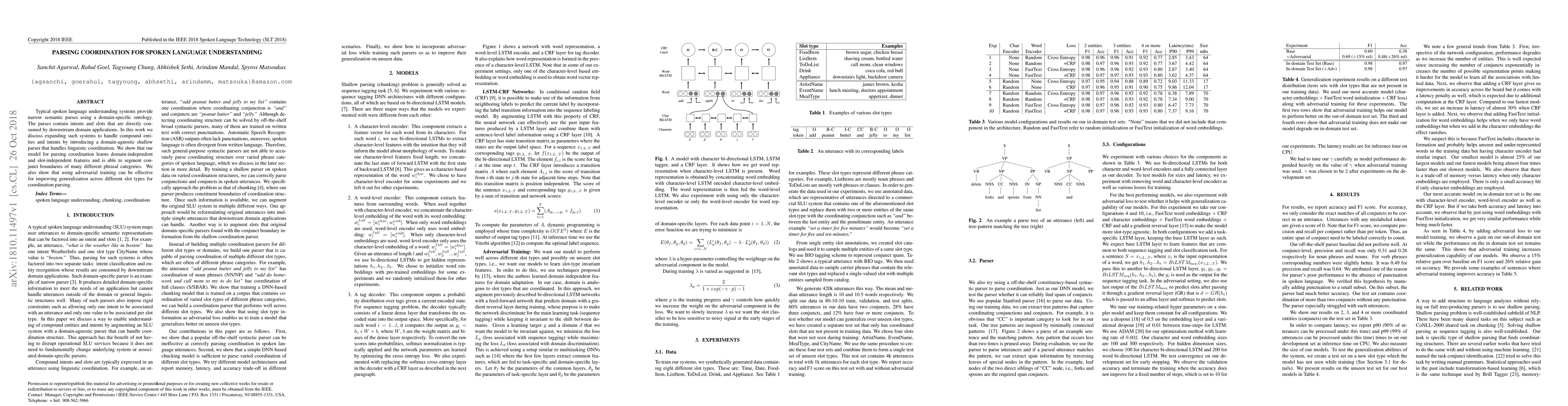 This paper introduces a domain-agnostic shallow parser for handling linguistic coordination in spoken language understanding, enabling it to parse compound entities and intents. The model demonstrates effective segmentation of conjunct boundaries and improved generalization through adversarial training.