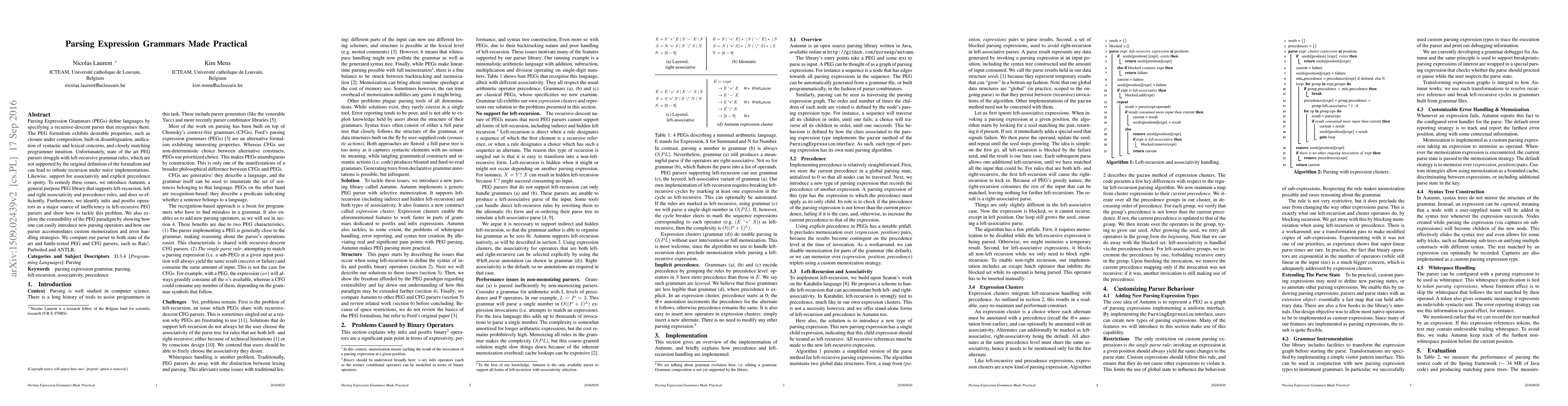 This paper introduces Autumn, a practical PEG library that addresses left-recursion, associativity, and precedence issues, enhancing efficiency and extensibility. It compares Autumn's performance and features against other PEG and CFG parsers, demonstrating its effectiveness.