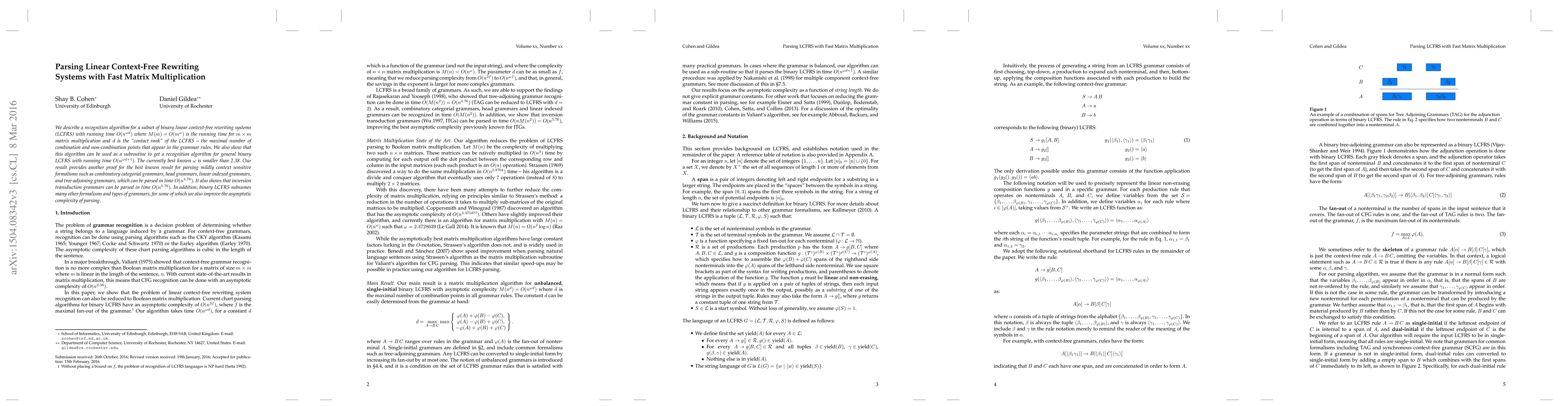 We describe a matrix multiplication recognition algorithm for a subset of binary linear context-free rewriting systems (LCFRS) with running time $O(n^{\omega d})$ where $M(m) = O(m^{\omega})$ is the running time for $m \times m$ matrix multiplication and $d$ is the "contact rank" of the LCFRS -- the maximal number of combination and non-combination points that appear in the grammar rules. We also show that this algorithm can be used as a subroutine to get a recognition algorithm for general binary LCFRS with running time $O(n^{\omega d + 1})$. The currently best known $\omega$ is smaller than $2.38$. Our result provides another proof for the best known result for parsing mildly context sensitive formalisms such as combinatory categorial grammars, head grammars, linear indexed grammars, and tree adjoining grammars, which can be parsed in time $O(n^{4.76})$. It also shows that inversion transduction grammars can be parsed in time $O(n^{5.76})$. In addition, binary LCFRS subsumes many other formalisms and types of grammars, for some of which we also improve the asymptotic complexity of parsing.