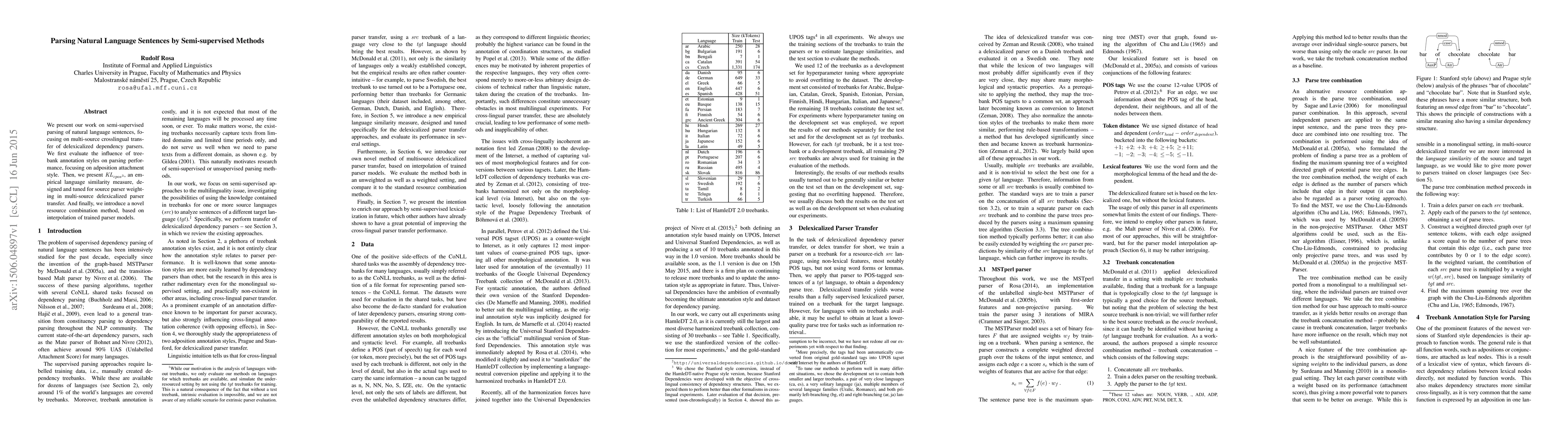This paper explores semi-supervised parsing of natural language sentences, emphasizing crosslingual transfer of delexicalized dependency parsers. It introduces KLcpos3, a language similarity measure for weighting source parsers, and a new resource combination method via model interpolation.