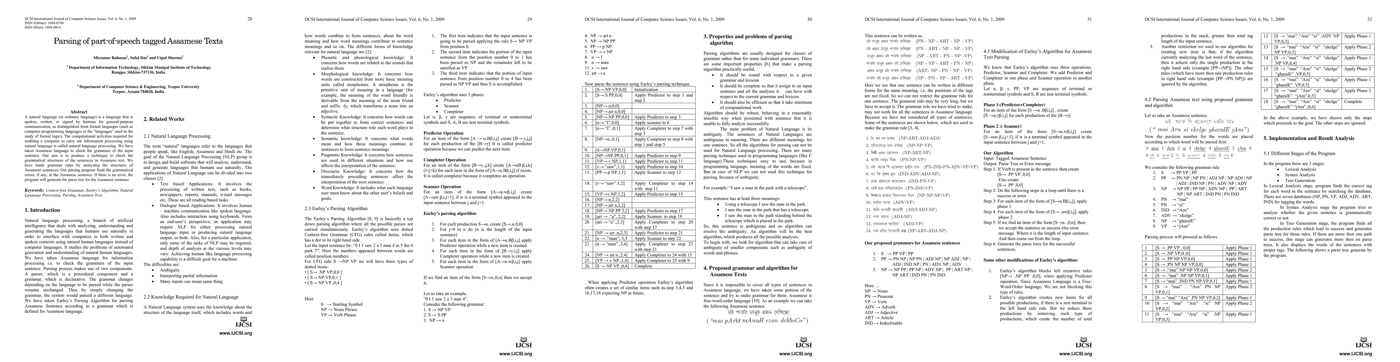 This paper develops a natural language processing technique to analyze grammatical structures in part-of-speech tagged Assamese texts. It creates grammar rules from sentence structures and uses a parsing program to detect grammatical errors and generate parse trees for error-free sentences.