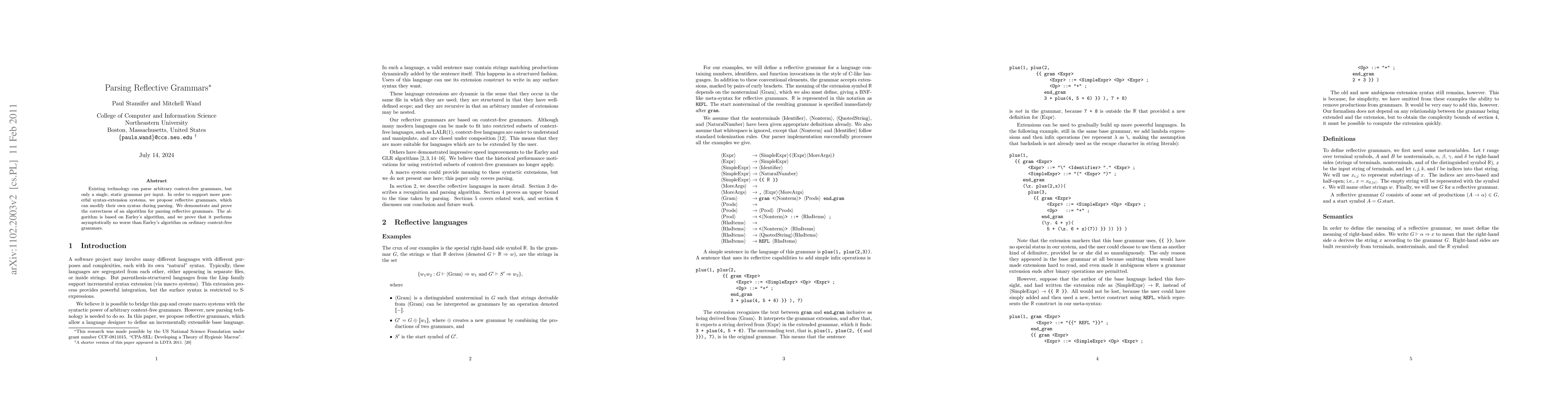 The paper introduces reflective grammars and an algorithm for parsing them, extending Earley's algorithm to handle grammars that can modify their own syntax during parsing.