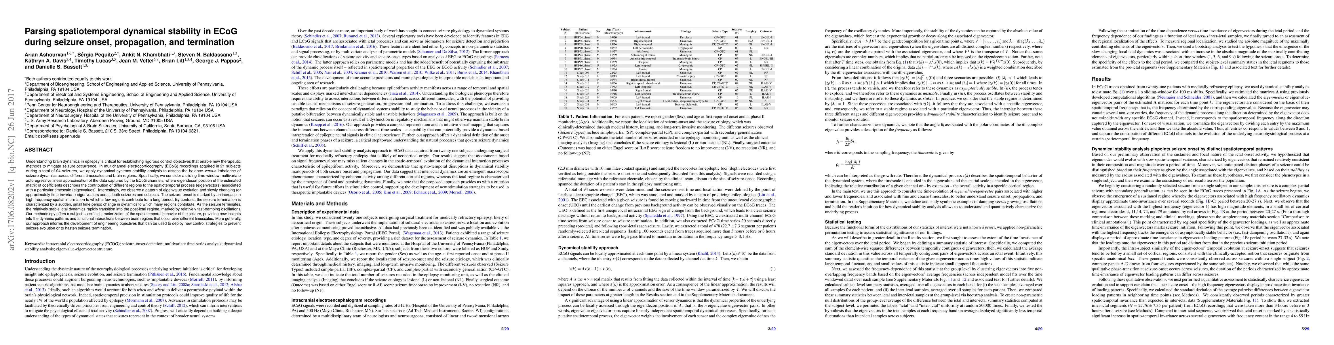This paper applies dynamical systems stability analysis to ECoG recordings during seizures to characterize spatiotemporal brain dynamics. It reveals distinct patterns of eigenvalue evolution and eigenvector stability during seizure onset, propagation, and termination, offering insights that could inform new seizure control strategies.
