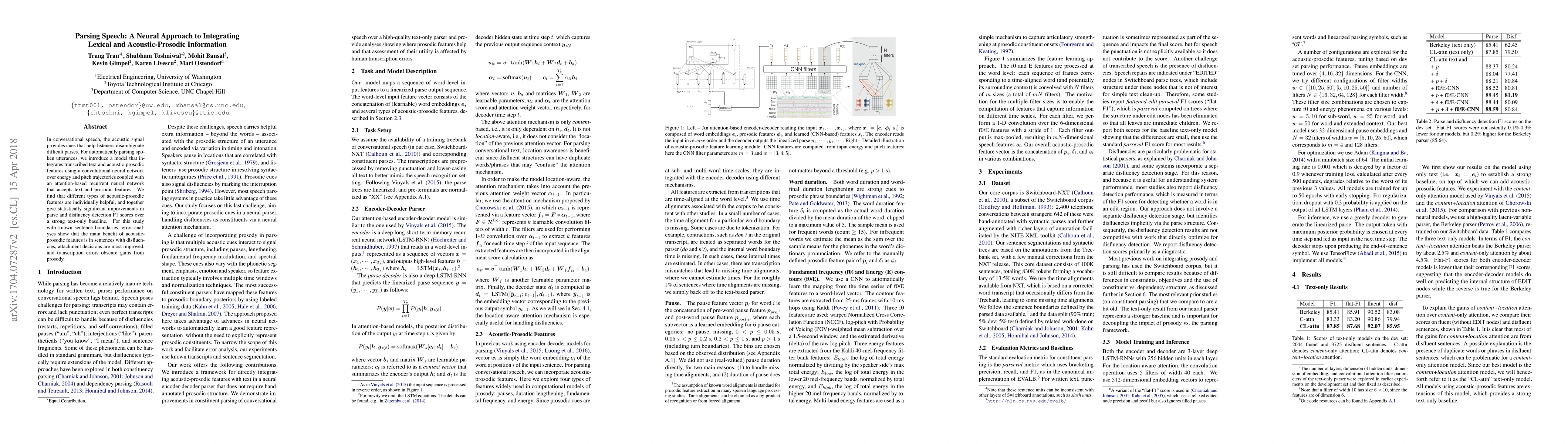 This paper proposes a neural model integrating lexical and acoustic-prosodic information to parse spoken utterances, showing significant improvements in parse and disfluency detection over text-only models, especially in sentences with disfluencies. The model uses a convolutional neural network and an attention-based recurrent neural network to combine transcribed text and prosodic features.
