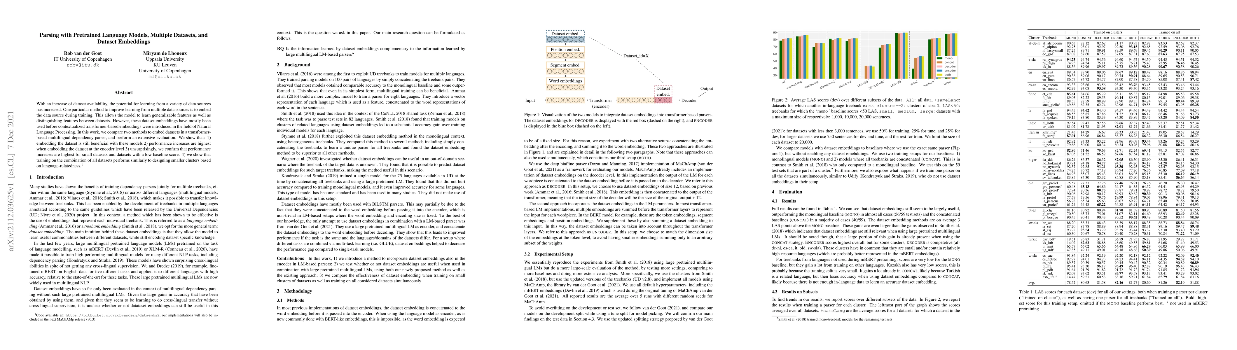 With an increase of dataset availability, the potential for learning from a variety of data sources has increased. One particular method to improve learning from multiple data sources is to embed the data source during training. This allows the model to learn generalizable features as well as distinguishing features between datasets. However, these dataset embeddings have mostly been used before contextualized transformer-based embeddings were introduced in the field of Natural Language Processing. In this work, we compare two methods to embed datasets in a transformer-based multilingual dependency parser, and perform an extensive evaluation. We show that: 1) embedding the dataset is still beneficial with these models 2) performance increases are highest when embedding the dataset at the encoder level 3) unsurprisingly, we confirm that performance increases are highest for small datasets and datasets with a low baseline score. 4) we show that training on the combination of all datasets performs similarly to designing smaller clusters based on language-relatedness.