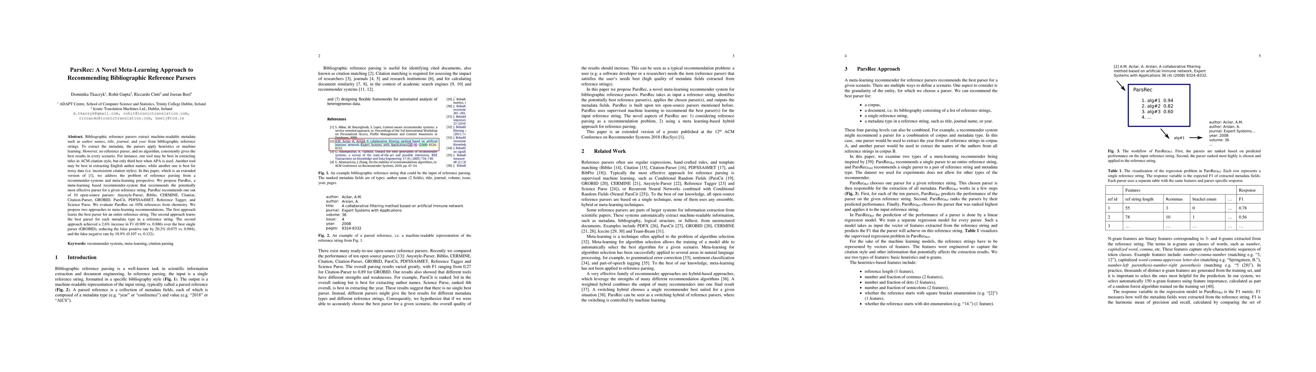 ParsRec is a meta-learning recommender system designed to recommend the most effective bibliographic reference parser for a given citation. It outperforms individual parsers by recommending the best out of 10 open-source parsers, achieving a 2.6% improvement in F1 score and a significant reduction in false positive and negative rates.