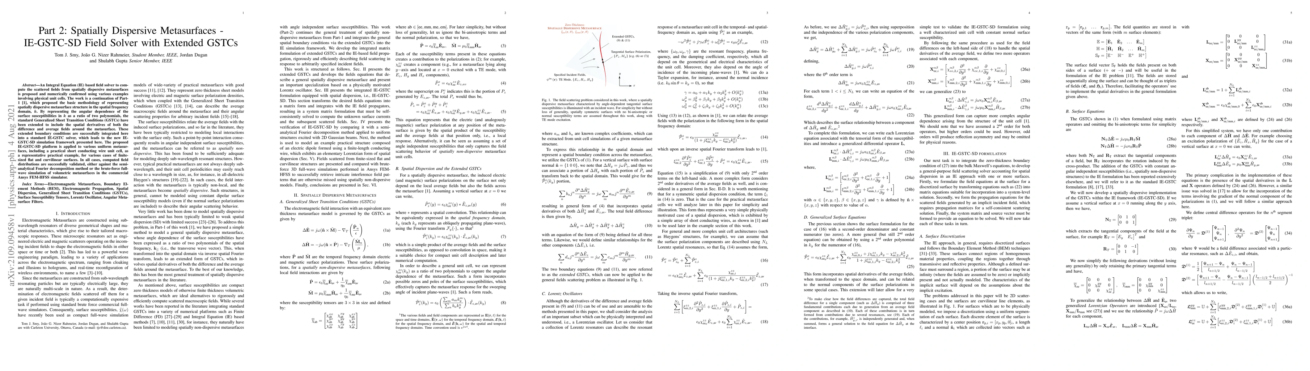 An Integral Equation (IE) based field solver to compute the scattered fields from spatially dispersive metasurfaces is proposed and numerically confirmed using various examples involving physical unit cells. The work is a continuation of [1], which proposed the basic methodology of representing spatially dispersive metasurface structure in the spatial frequency domain, $\boldsymbol{k}$. By representing the angular dependence of the surface susceptibilities in $\boldsymbol{k}$ as a ratio of two polynomials, the standard Generalized Sheet Transition Conditions (GSTCs) have been extended to include the spatial derivatives of both the difference and average fields around the metasurface. These extended boundary conditions are successfully integrated here into a standard IE-GSTC solver, which leads to the new IE-GSTC-SD simulation framework presented here. The proposed IE-GSTC-SD platform is applied to various uniform metasurfaces, including a practical short conducting wire unit cell, as a representative practical example, for various cases of finite-sized flat and curvilinear surfaces. In all cases, computed field distributions are successfully validated, either against the semi-analytical Fourier decomposition method or the brute-force full-wave simulation of volumetric metasurfaces in the commercial Ansys FEM-HFSS simulator.
