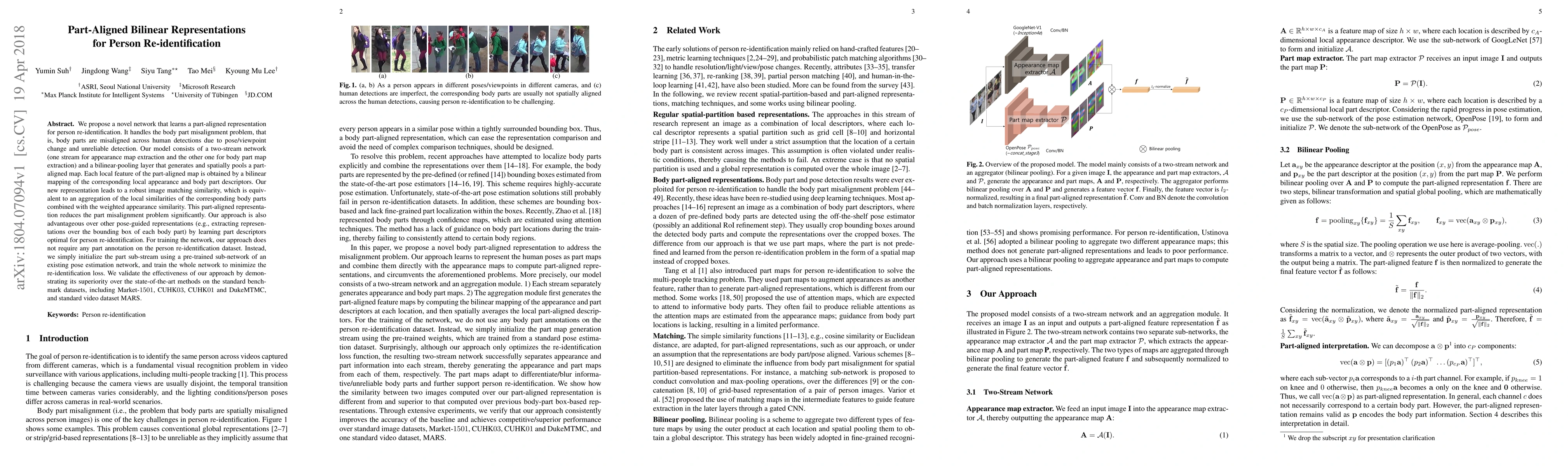 This paper introduces a novel network for person re-identification that learns a part-aligned representation to address body part misalignment issues. The proposed two-stream network and bilinear-pooling layer generate a robust part-aligned map, significantly reducing misalignment and outperforming state-of-the-art methods on benchmark datasets.