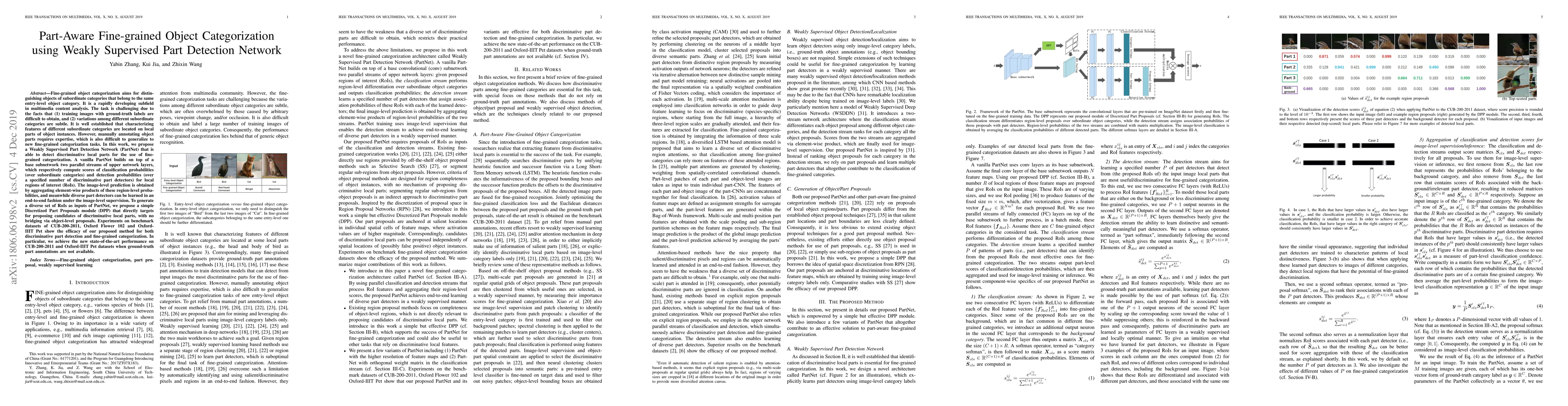 This paper proposes a Weakly Supervised Part Detection Network (PartNet) to address the challenge of fine-grained object categorization without requiring detailed part annotations. PartNet uses a Discretized Part Proposals module to detect local discriminative parts and achieves state-of-the-art results on the CUB-200-2011 dataset.