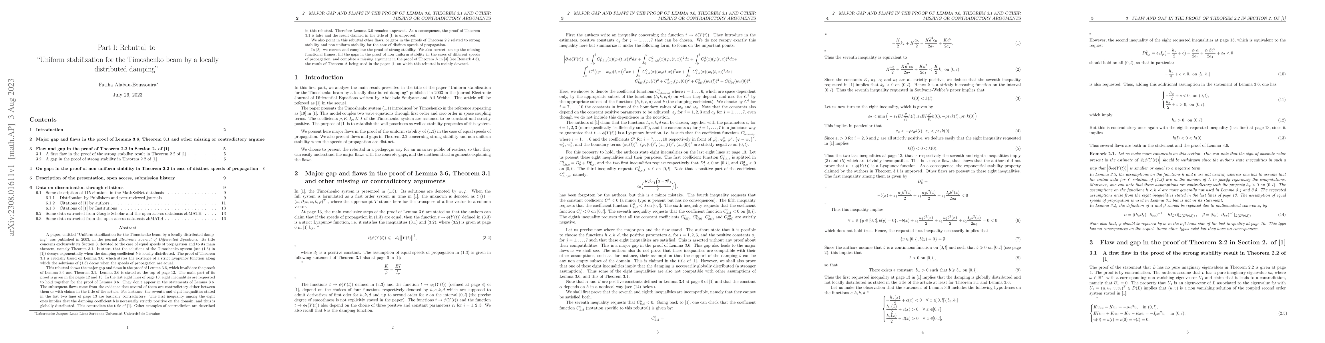 A paper, entitled "Uniform stabilization for the Timoshenko beam by a locally distributed damping" was published in 2003, in the journal Electronic Journal of Differential Equations. Its title concerns exclusively its Section 3, devoted to the case of equal speeds of propagation and to its main theorem, namely Theorem 3.1. It states that the solutions of the Timoshenko system (see (1.3) in [1]) decays exponentially when the damping coefficient b is locally distributed. The proof of Theorem 3.1 is crucially based on Lemma 3.6, which states the existence of a strict Lyapunov function along which the solutions of (1.3) decay when the speeds of propagation are equal. This rebuttal shows the major gap and flaws in the proof of Lemma 3.6, which invalidate the proofs of Lemma 3.6 and Theorem 3.1. Lemma 3.6 is stated at the top of page 12. The main part of its proof is given in the pages 12 and 13. In the last eight lines of page 13, eight inequalities are requested to hold together for the proof of Lemma 3.6. They don't appear in the statements of Lemma 3.6. The subsequent flaws come from the evidence that several of them are contradictory either between them or with claims in the title of the article. We also point in this rebuttal other flaws, or gaps in the proofs of Theorem 2.2 related to strong stability and non uniform stability for the case of distinct speeds of propagation. In [3], we correct and complete the proof of strong stability. We also correct, set up the missing functional frames, fill the gaps in the proof of non uniform stability in the cases of different speeds of propagation, and complete a missing argument in the proof of Theorem A in [4] (see Remark 4.3), the result of Theorem A being used in the paper [1] on which this rebuttal is mainly devoted.