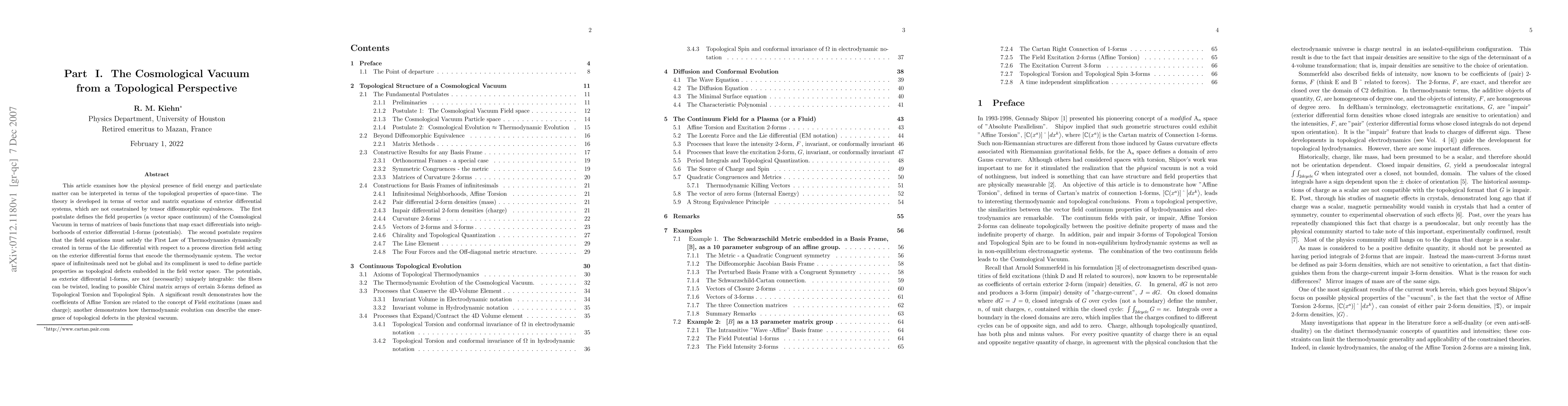 This article examines how the physical presence of field energy and particulate matter can be interpreted in terms of the topological properties of space-time. The theory is developed in terms of vector and matrix equations of exterior differential systems, which are not constrained by tensor diffeomorphic equivalences. The first postulate defines the field properties (a vector space continuum) of the Cosmological Vacuum in terms of matrices of basis functions that map exact differentials into neighborhoods of exterior differential 1-forms (potentials). The second postulate requires that the field equations must satisfy the First Law of Thermodynamics dynamically created in terms of the Lie differential with respect to a process direction field acting on the exterior differential forms that encode the thermodynamic system. The vector space of infinitesimals need not be global and its compliment is used to define particle properties as topological defects embedded in the field vector space. The potentials, as exterior differential 1-forms, are not (necessarily) uniquely integrable: the fibers can be twisted, leading to possible Chiral matrix arrays of certain 3-forms defined as Topological Torsion and Topological Spin. A significant result demonstrates how the coefficients of Affine Torsion are related to the concept of Field excitations (mass and charge); another demonstrates how thermodynamic evolution can describe the emergence of topological defects in the physical vacuum.