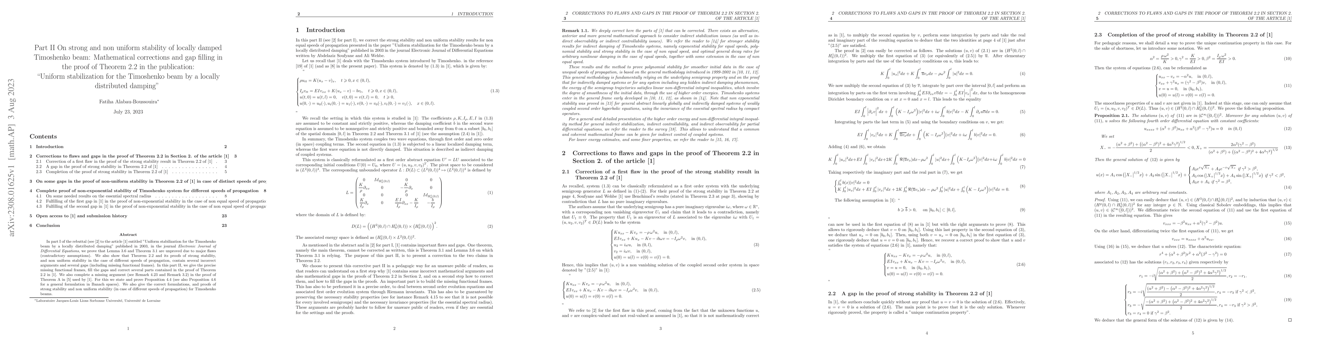 In part I of the rebuttal (see [2] to the article [1] entitled "Uniform stabilization for the Timoshenko beam by a locally distributed damping" published in 2003, in the journal Electronic Journal of Differential Equations, we prove that Lemma 3.6 and Theorem 3.1 are unproved due to major flaws (contradictory assumptions). We also show that Theorem 2.2 and its proofs of strong stability, and non uniform stability in the case of different speeds of propagation, contain several incorrect arguments and several gaps (including missing functional frames). In this part II, we give the precise missing functional frames, fill the gaps and correct several parts contained in the proof of Theorem 2.2 in [1]. We also complete a missing argument (see Remark 4.23 and Remark 3.2) in the proof of Theorem A in [5] used by [1]. For this we state and prove Proposition 4.4 (see also Proposition 4.6 for a general formulation in Banach spaces). We also give the correct formulations, and proofs of strong stability and non uniform stability (in case of different speeds of propagation) for Timoshenko beams.