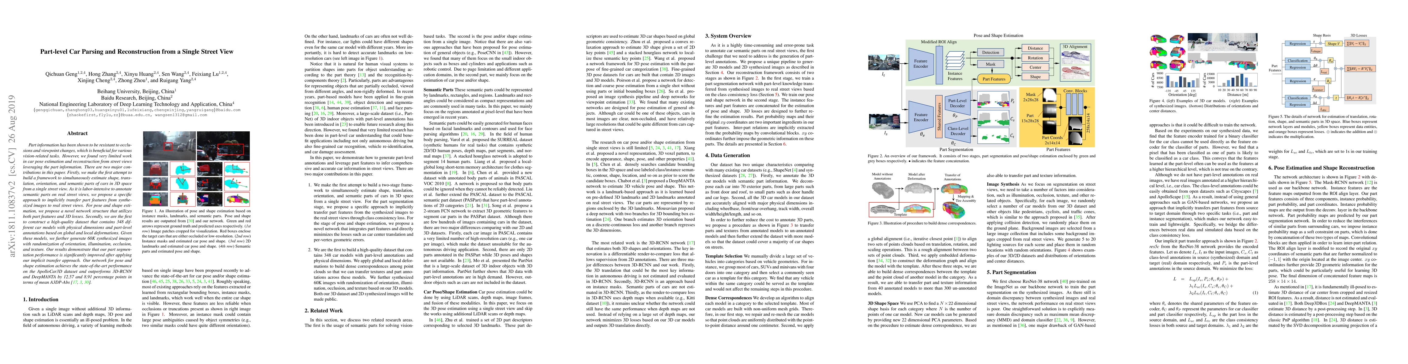 Part information has been shown to be resistant to occlusions and viewpoint changes, which is beneficial for various vision-related tasks. However, we found very limited work in car pose estimation and reconstruction from street views leveraging the part information. There are two major contributions in this paper. Firstly, we make the first attempt to build a framework to simultaneously estimate shape, translation, orientation, and semantic parts of cars in 3D space from a single street view. As it is labor-intensive to annotate semantic parts on real street views, we propose a specific approach to implicitly transfer part features from synthesized images to real street views. For pose and shape estimation, we propose a novel network structure that utilizes both part features and 3D losses. Secondly, we are the first to construct a high-quality dataset that contains 348 different car models with physical dimensions and part-level annotations based on global and local deformations. Given these models, we further generate 60K synthesized images with randomization of orientation, illumination, occlusion, and texture. Our results demonstrate that our part segmentation performance is significantly improved after applying our implicit transfer approach. Our network for pose and shape estimation achieves the state-of-the-art performance on the ApolloCar3D dataset and outperforms 3D-RCNN and DeepMANTA by 12.57 and 8.91 percentage points in terms of mean A3DP-Abs.