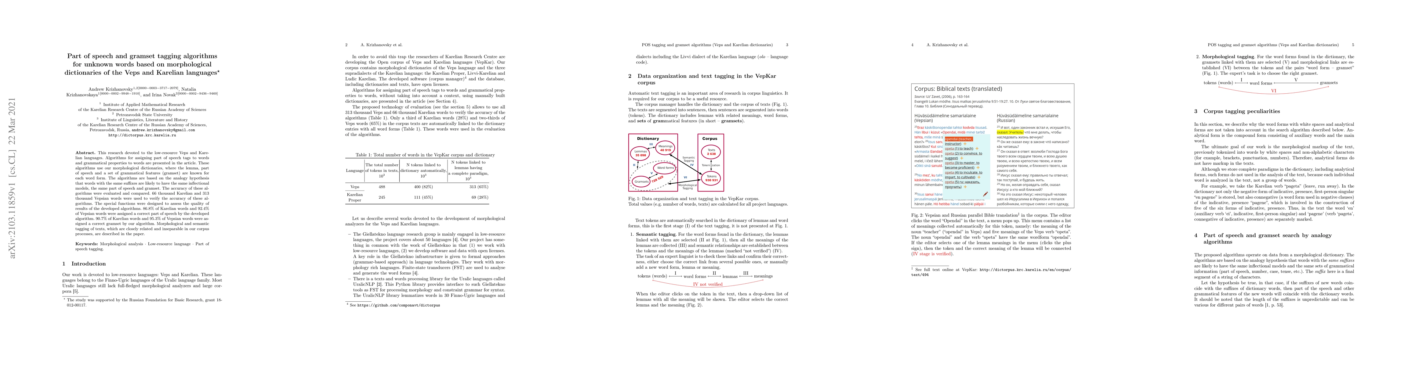 This research devoted to the low-resource Veps and Karelian languages. Algorithms for assigning part of speech tags to words and grammatical properties to words are presented in the article. These algorithms use our morphological dictionaries, where the lemma, part of speech and a set of grammatical features (gramset) are known for each word form. The algorithms are based on the analogy hypothesis that words with the same suffixes are likely to have the same inflectional models, the same part of speech and gramset. The accuracy of these algorithms were evaluated and compared. 313 thousand Vepsian and 66 thousand Karelian words were used to verify the accuracy of these algorithms. The special functions were designed to assess the quality of results of the developed algorithms. 92.4% of Vepsian words and 86.8% of Karelian words were assigned a correct part of speech by the developed algorithm. 95.3% of Vepsian words and 90.7% of Karelian words were assigned a correct gramset by our algorithm. Morphological and semantic tagging of texts, which are closely related and inseparable in our corpus processes, are described in the paper.