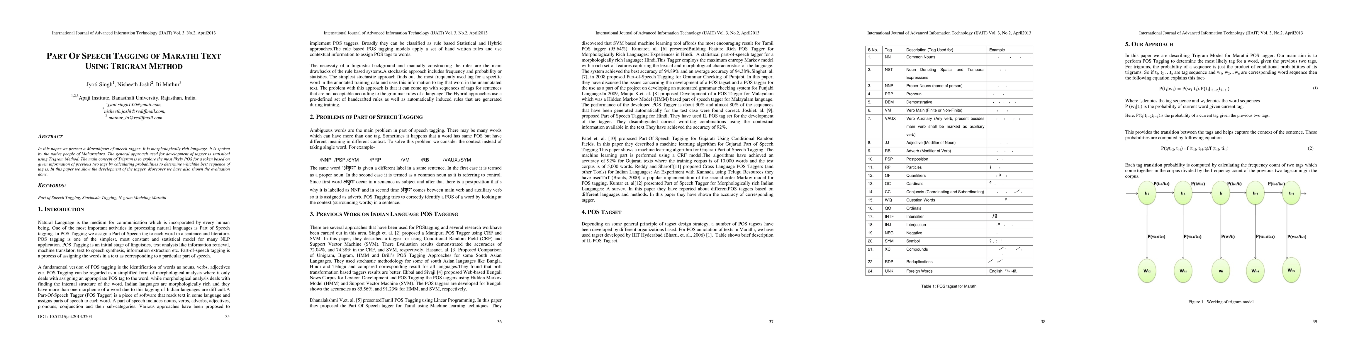 This paper develops a statistical part-of-speech tagger for Marathi using a trigram method, which predicts the most likely POS based on the previous two tags, and presents an evaluation of its performance.