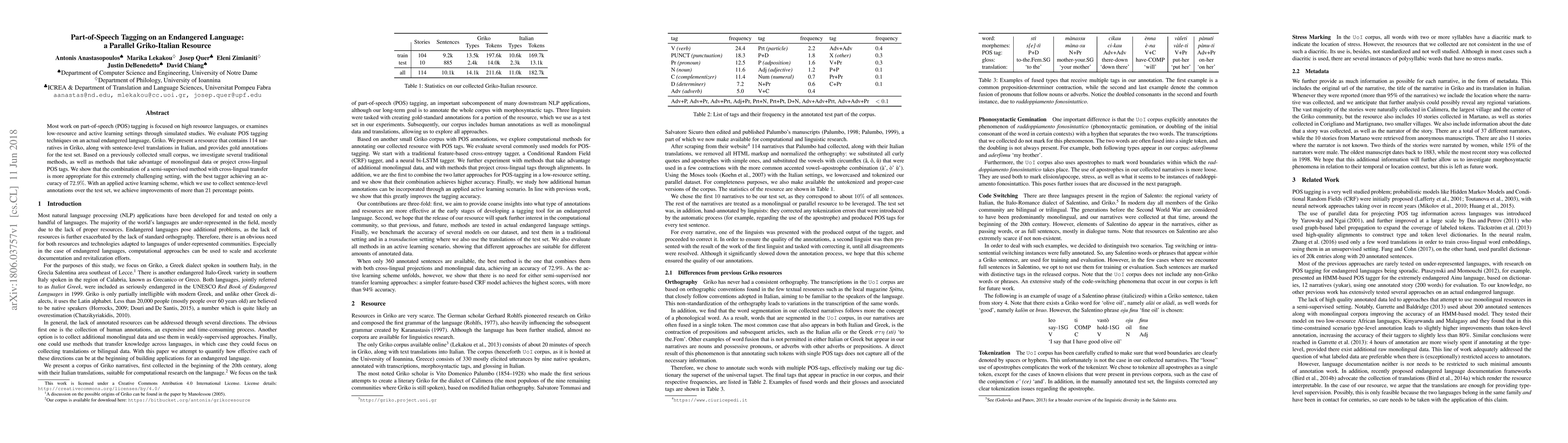 This paper evaluates part-of-speech tagging techniques on the endangered Griko language, presenting a new resource with 114 narratives and Italian translations. The study finds that a combination of semi-supervised methods and cross-lingual transfer achieves the best tagging accuracy of 72.9%, with further improvements through active learning.