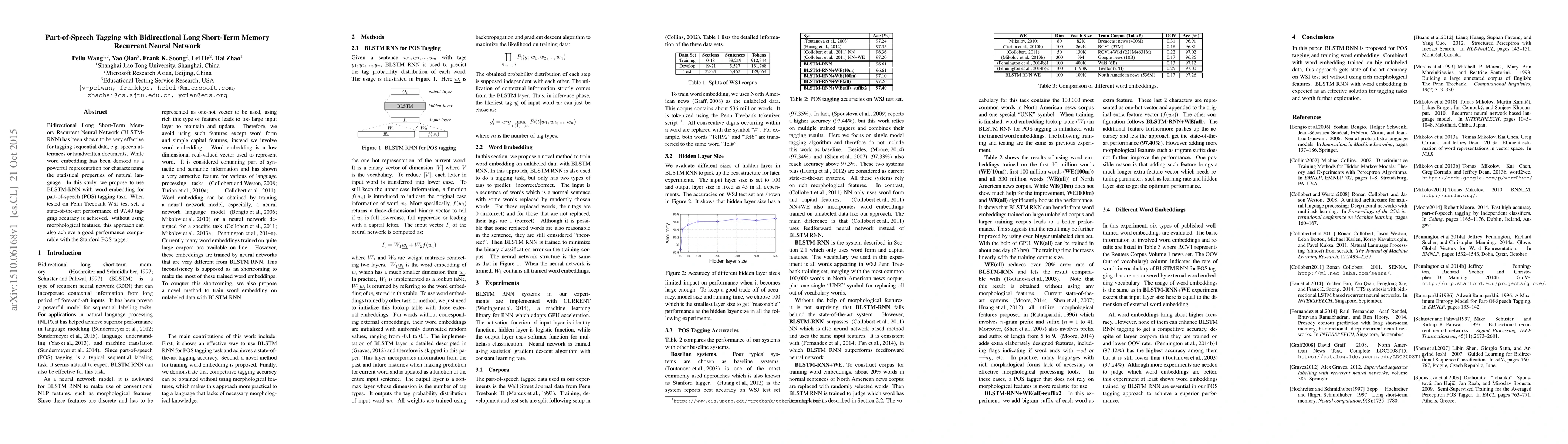 This paper proposes using a Bidirectional Long Short-Term Memory Recurrent Neural Network (BLSTM-RNN) with word embedding for part-of-speech tagging, achieving a state-of-the-art accuracy of 97.40% on the Penn Treebank WSJ test set, demonstrating strong performance without relying on morphological features.