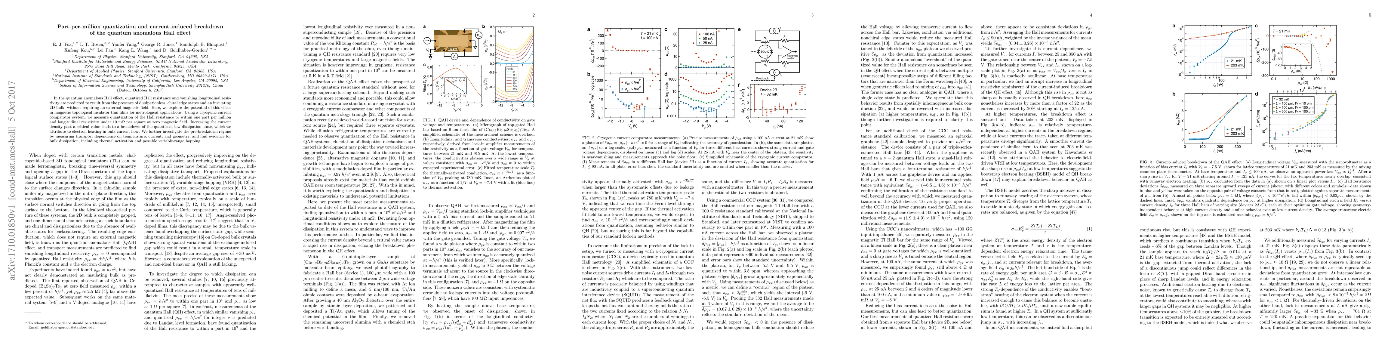 In the quantum anomalous Hall effect, quantized Hall resistance and vanishing longitudinal resistivity are predicted to result from the presence of dissipationless, chiral edge states and an insulating 2D bulk, without requiring an external magnetic field. Here, we explore the potential of this effect in magnetic topological insulator thin films for metrological applications. Using a cryogenic current comparator system, we measure quantization of the Hall resistance to within one part per million and longitudinal resistivity under 10 m$\Omega$ per square at zero magnetic field. Increasing the current density past a critical value leads to a breakdown of the quantized, low-dissipation state, which we attribute to electron heating in bulk current flow. We further investigate the pre-breakdown regime by measuring transport dependence on temperature, current, and geometry, and find evidence for bulk dissipation, including thermal activation and possible variable-range hopping.
