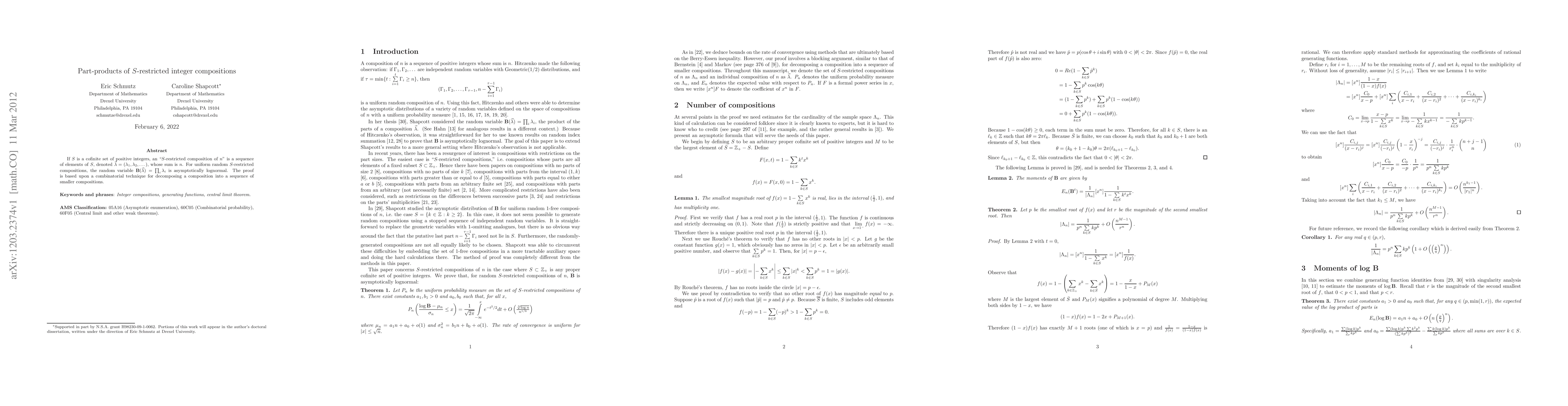 If $S$ is a cofinite set of positive integers, an "$S$-restricted composition of $n$" is a sequence of elements of $S$, denoted $\vec{\lambda}=(\lambda_1,\lambda_2,...)$, whose sum is $n$. For uniform random $S$-restricted compositions, the random variable ${\bf B}(\vec{\lambda})=\prod_i \lambda_i$ is asymptotically lognormal. The proof is based upon a combinatorial technique for decomposing a composition into a sequence of smaller compositions.
