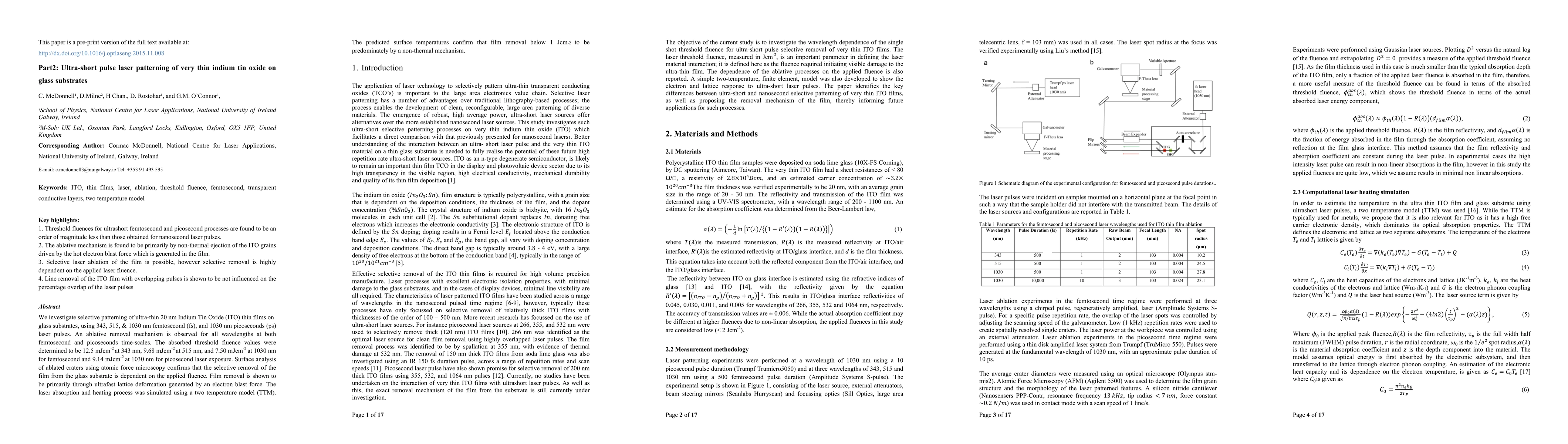 We investigate selective patterning of ultra-thin 20 nm Indium Tin Oxide (ITO) thin films on glass substrates, using 343, 515, and 1030 nm femtosecond (fs), and 1030 nm picoseconds (ps) laser pulses. An ablative removal mechanism is observed for all wavelengths at both femtosecond and picoseconds time-scales. The absorbed threshold fluence values were determined to be 12.5 mJ/cm2 at 343 nm, 9.68 mJ/cm2 at 515 nm, and 7.50 mJ/cm2 at 1030 nm for femtosecond and 9.14 mJ/cm2 at 1030 nm for picosecond laser exposure. Surface analysis of ablated craters using atomic force microscopy confirms that the selective removal of the film from the glass substrate is dependent on the applied fluence. Film removal is shown to be primarily through ultrafast lattice deformation generated by an electron blast force. The laser absorption and heating process was simulated using a two temperature model (TTM). The predicted surface temperatures confirm that film removal below 1 J/cm2 to be predominately by a non-thermal mechanism.
