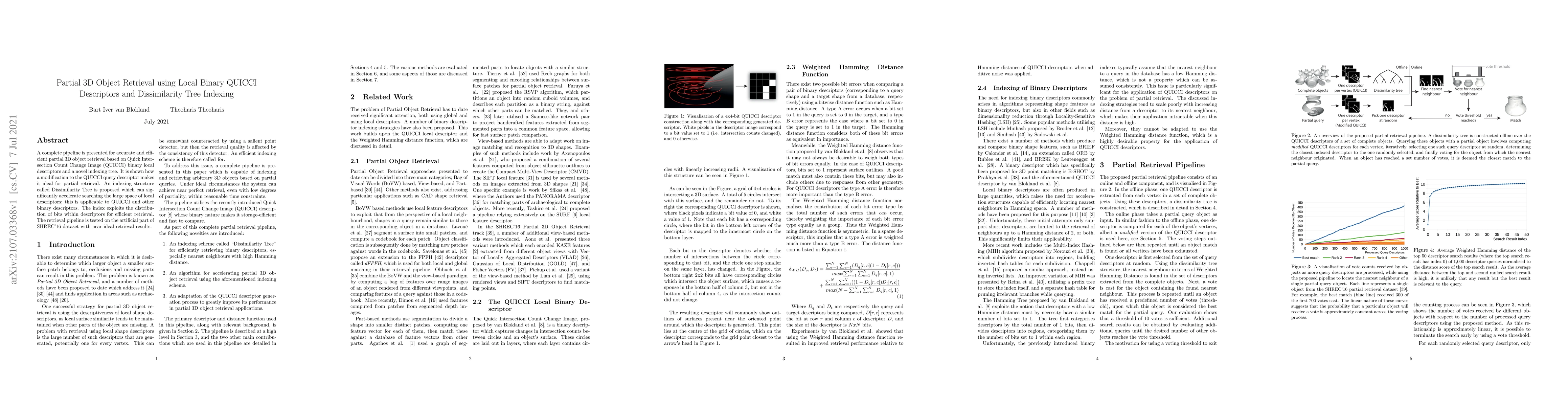 This paper presents a pipeline for partial 3D object retrieval using modified QUICCI binary local descriptors and a Dissimilarity Tree indexing structure, which significantly speeds up searches in large descriptor spaces, achieving near-ideal retrieval results on the SHREC'16 dataset.