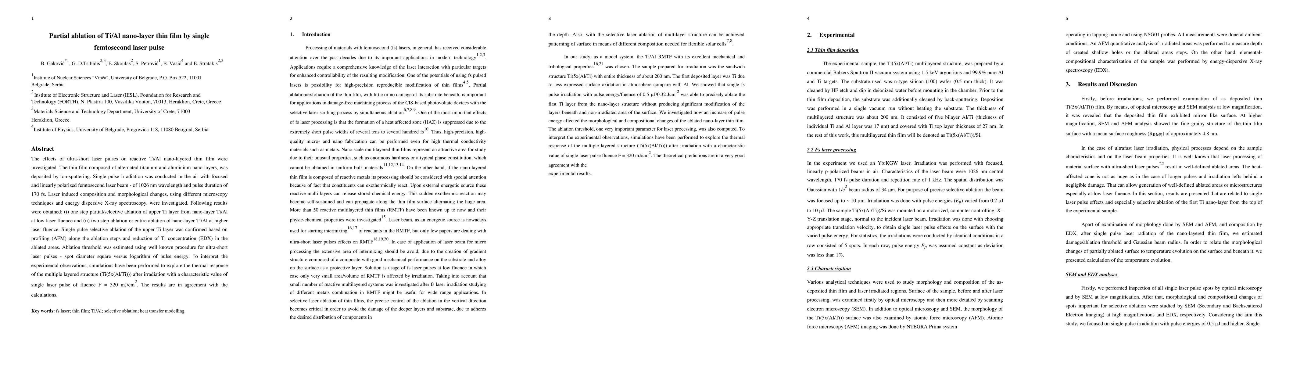 This paper investigates the effects of a single femtosecond laser pulse on a Ti/Al nano-layered thin film, showing selective ablation of the upper titanium layer at low fluence and complete ablation at higher fluences. Simulations confirm thermal response modeling predictions.