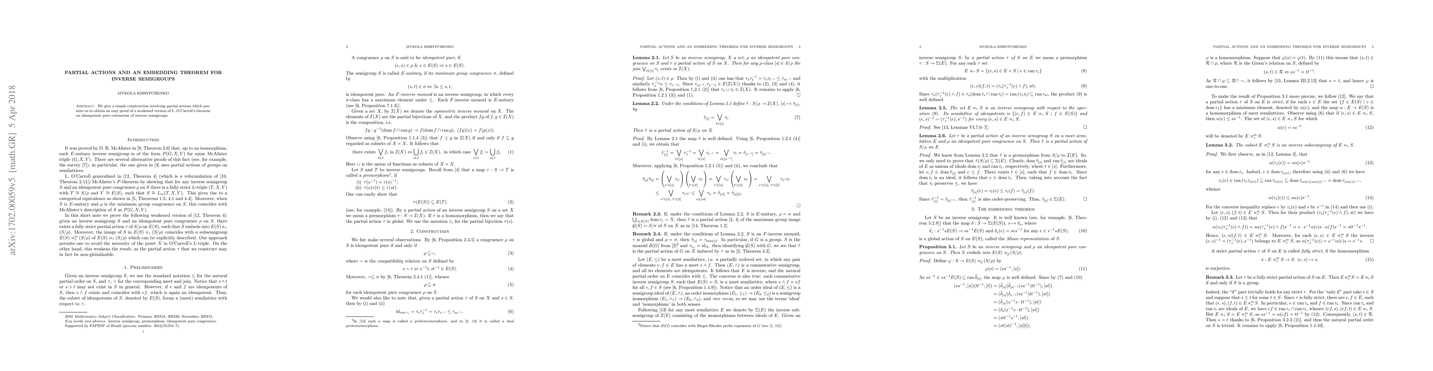 We give a simple construction involving partial actions which permits us to obtain an easy proof of a weakened version of L. O'Carroll's theorem on idempotent pure extensions of inverse semigroups.
