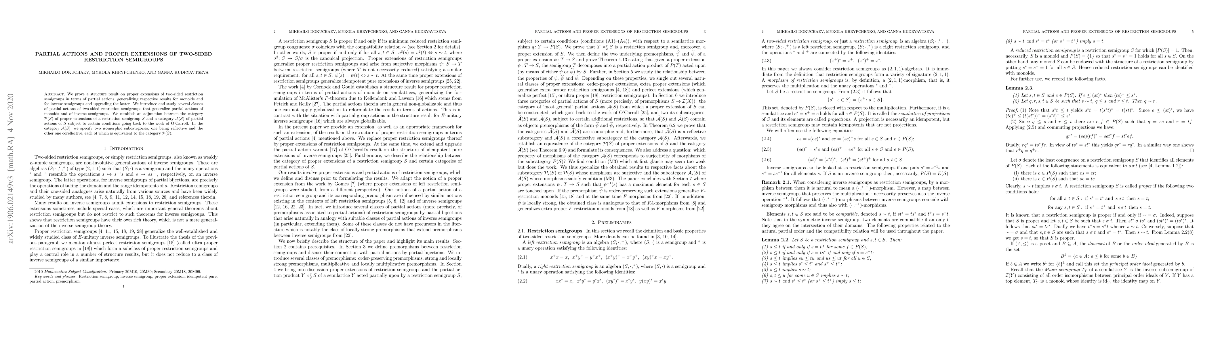 We prove a structure result on proper extensions of two-sided restriction semigroups in terms of partial actions, generalizing respective results for monoids and for inverse semigroups and upgrading the latter. We introduce and study several classes of partial actions of two-sided restriction semigroups that generalize partial actions of monoids and of inverse semigroups. We establish an adjunction between the category ${\mathcal{P}}(S)$ of proper extensions of a restriction semigroup (or, in particular, an inverse semigroup) $S$ and a category ${\mathcal{A}}(S)$ of partial actions of $S$ subject to certain conditions going back to the work of O'Carroll. In the category ${\mathcal{A}}(S)$, we specify two isomorphic subcategories, one being reflective and the other one coreflective, each of which is equivalent to the category ${\mathcal{P}}(S)$.