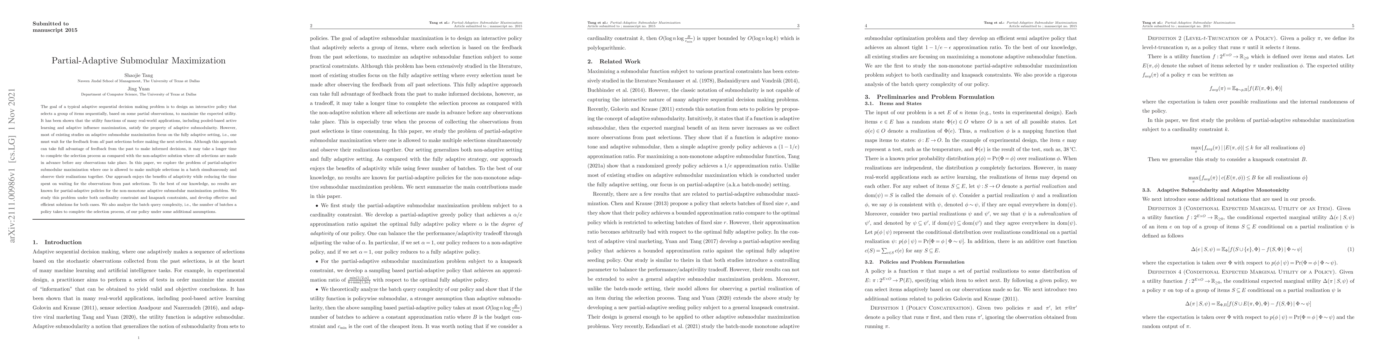 This paper explores partial-adaptive submodular maximization, allowing batch selections and observations to maximize utility, contrasting with fully adaptive settings. It develops effective solutions for both cardinality and knapsack constraints, analyzing batch query complexity under additional assumptions.