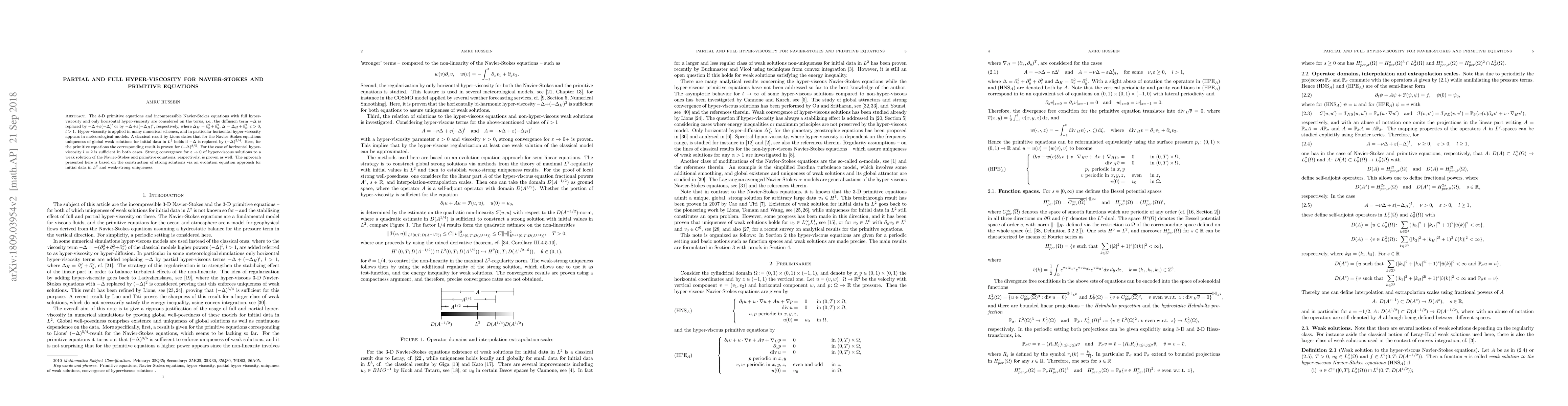 The $3$-D primitive equations and incompressible Navier-Stokes equations with full hyper-viscosity and only horizontal hyper-viscosity are considered on the torus, i.e., the diffusion term $-\Delta$ is replaced by $-\Delta+ \varepsilon(-\Delta)^{l}$ or by $-\Delta + \varepsilon(-\Delta_H)^{l}$, respectively, where $\Delta_H = \partial_x^2+\partial_y^2 $, $\Delta= \Delta_H + \partial_z^2$, $\varepsilon> 0$, $l>1$. Hyper-viscosity is applied in many numerical schemes, and in particular horizontal hyper-viscosity appears in meteorological models. A classical result by Lions states that for the Navier-Stokes equations uniqueness of global weak solutions for initial data in $L^2$ holds if $-\Delta$ is replaced by $(-\Delta)^{5/4}$. Here, for the primitive equations the corresponding result is proven for $(-\Delta)^{8/5}$. For the case of horizontal hyper-viscosity $l=2$ is sufficient in both cases. Strong convergence for $\varepsilon\to 0$ of hyper-viscous solutions to a weak solution of the Navier-Stokes and primitive equations, respectively, is proven as well. The approach presented here is based on the construction of strong solutions via an evolution equation approach for initial data in $L^2$ and weak-strong uniqueness.