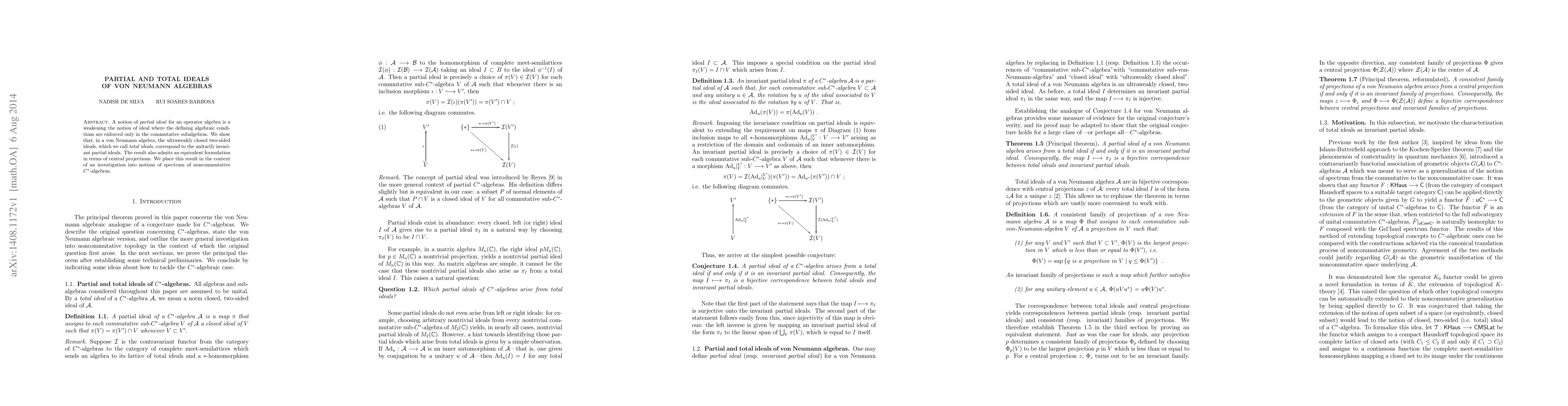 A notion of partial ideal for an operator algebra is a weakening the notion of ideal where the defining algebraic conditions are enforced only in the commutative subalgebras. We show that, in a von Neumann algebra, the ultraweakly closed two-sided ideals, which we call total ideals, correspond to the unitarily invariant partial ideals. The result also admits an equivalent formulation in terms of central projections. We place this result in the context of an investigation into notions of spectrum of noncommutative $C^*$-algebras.