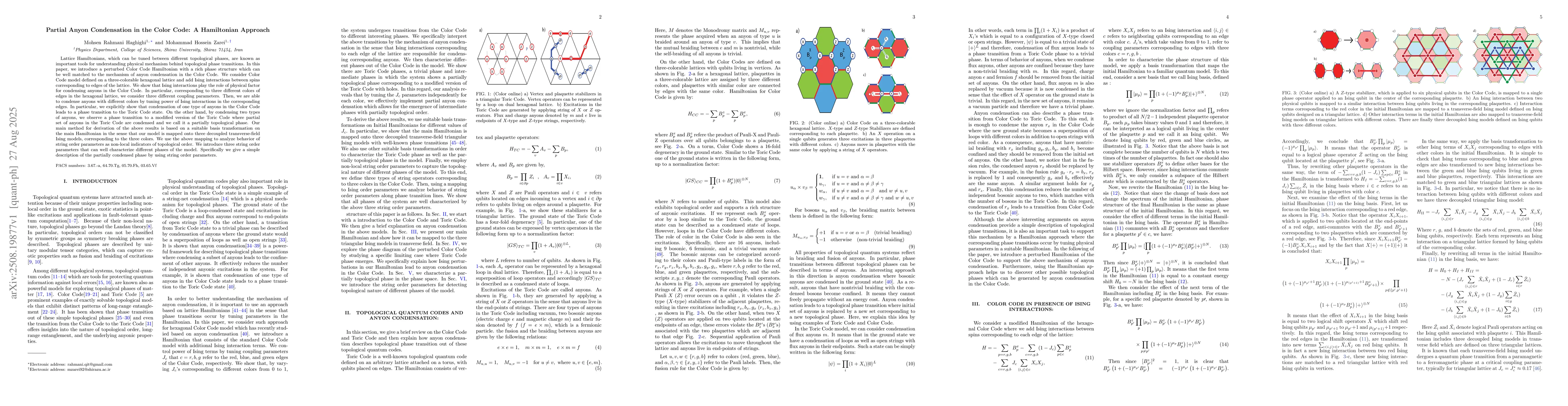 Lattice Hamiltonians, which can be tuned between different topological phases, are known as important tools for understanding physical mechanism behind topological phase transitions. In this paper, we introduce a perturbed Color Code Hamiltonian with a rich phase structure which can be well matched to the mechanism of anyon condensation in the Color Code. We consider Color Code model defined on a three-colorable hexagonal lattice and add Ising interactions between spins corresponding to edges of the lattice. We show that Ising interactions play the role of physical factor for condensing anyons in the Color Code. In particular, corresponding to three different colors of edges in the hexagonal lattice, we consider three different coupling parameters. Then, we are able to condense anyons with different colors by tuning power of Ising interactions in the corresponding edges. In particular, we explicitly show that condensation of one type of anyons in the Color Code leads to a phase transition to the Toric Code state. On the other hand, by condensing two types of anyons, we observe a phase transition to a modified version of the Toric Code where partial set of anyons in the Toric Code are condensed and we call it a partially topological phase. Our main method for derivation of the above results is based on a suitable basis transformation on the main Hamiltonian in the sense that our model is mapped onto three decoupled transverse-field Ising models, corresponding to the three colors. We use the above mapping to analyze behavior of string order parameters as non-local indicators of topological order. We introduce three string order parameters that can well characterize different phases of the model. Specifically we give a simple description of the partially condensed phase by using string order parameters.