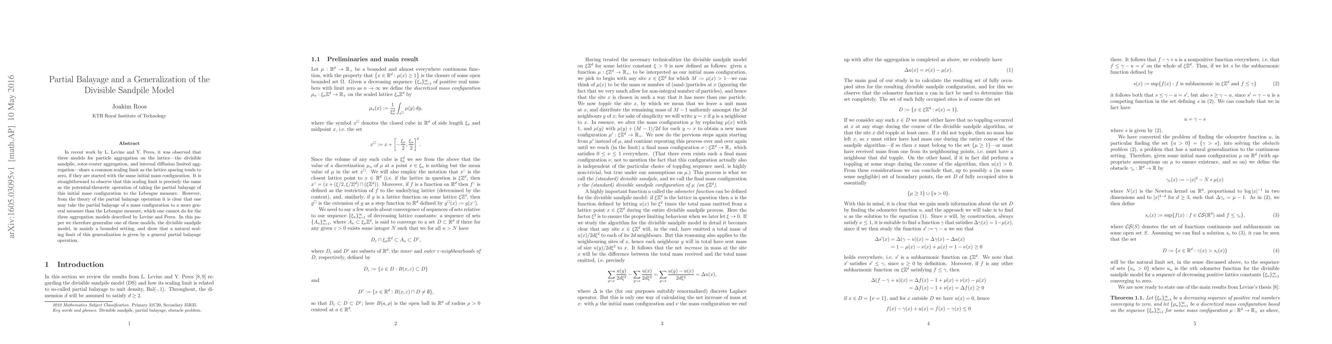 In recent work by L. Levine and Y. Peres, it was observed that three models for particle aggregation on the lattice - the divisible sandpile, rotor-router aggregation, and internal diffusion limited aggregation - share a common scaling limit as the lattice spacing tends to zero, if they are started with the same initial mass configuration. It is straightforward to observe that this scaling limit is precisely the same as the potential-theoretic operation of taking the partial balayage of this initial mass configuration to the Lebesgue measure. However, from the theory of the partial balayage operation it is clear that one may take the partial balayage of a mass configuration to a more general measure than the Lebesgue measure, which one cannot do for the three aggregation models described by Levine and Peres. In this paper we therefore generalize one of these models, the divisible sandpile model, in mainly a bounded setting, and show that a natural scaling limit of this generalization is given by a general partial balayage operation.