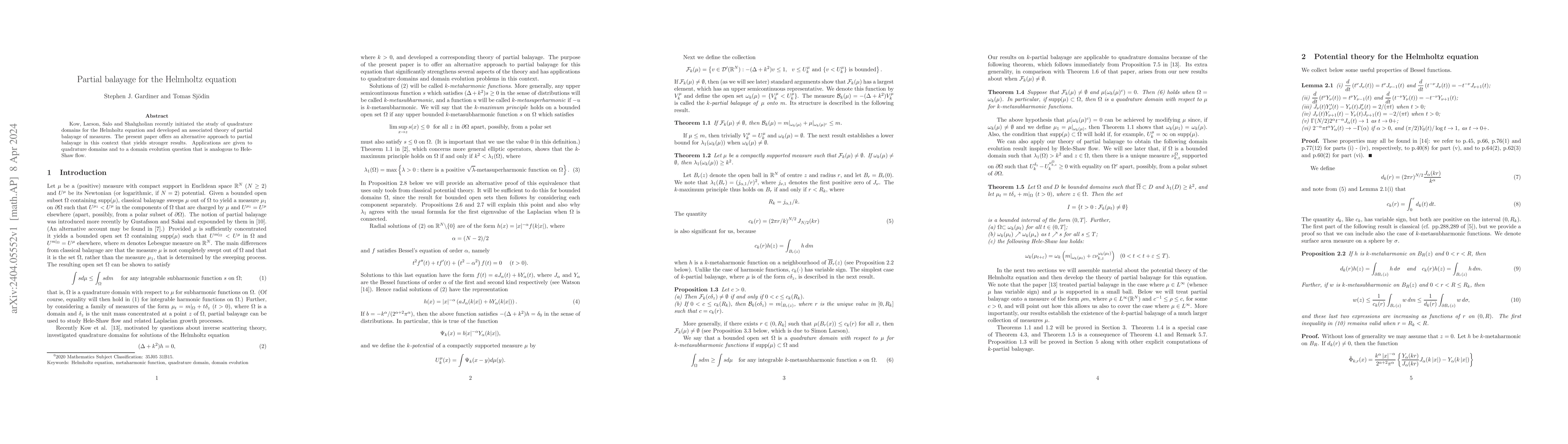 This paper presents an alternative method for partial balayage in the context of the Helmholtz equation, achieving stronger results compared to existing theories. It applies this new approach to quadrature domains and to a domain evolution problem similar to Hele-Shaw flow.