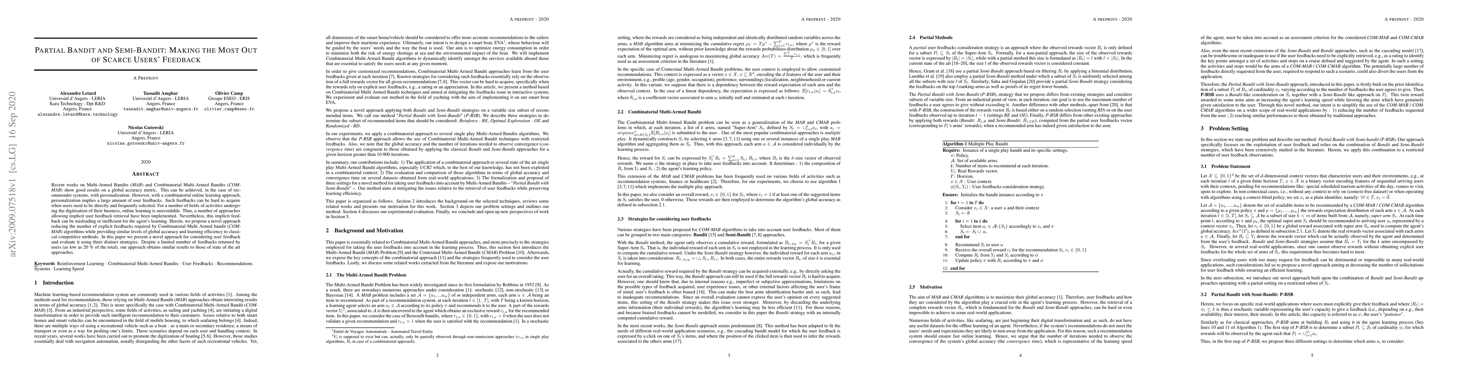 Recent works on Multi-Armed Bandits (MAB) and Combinatorial Multi-Armed Bandits (COM-MAB) show good results on a global accuracy metric. This can be achieved, in the case of recommender systems, with personalization. However, with a combinatorial online learning approach, personalization implies a large amount of user feedbacks. Such feedbacks can be hard to acquire when users need to be directly and frequently solicited. For a number of fields of activities undergoing the digitization of their business, online learning is unavoidable. Thus, a number of approaches allowing implicit user feedback retrieval have been implemented. Nevertheless, this implicit feedback can be misleading or inefficient for the agent's learning. Herein, we propose a novel approach reducing the number of explicit feedbacks required by Combinatorial Multi Armed bandit (COM-MAB) algorithms while providing similar levels of global accuracy and learning efficiency to classical competitive methods. In this paper we present a novel approach for considering user feedback and evaluate it using three distinct strategies. Despite a limited number of feedbacks returned by users (as low as 20% of the total), our approach obtains similar results to those of state of the art approaches.