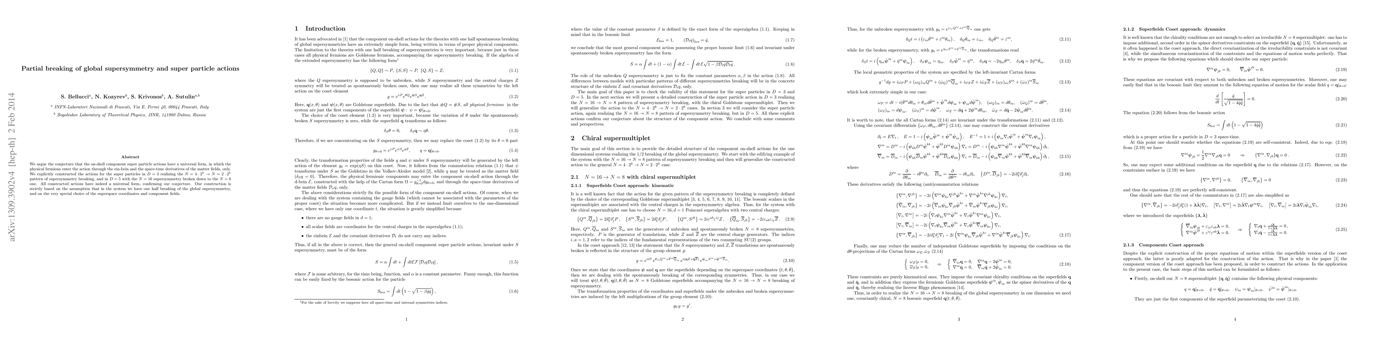 We argue the conjecture that the on-shell component super particle actions have a universal form, in which the physical fermions enter the action through the ein-bein and the space-time derivatives of the matter fields, only. We explicitly constructed the actions for the super particles in $D=3$ realizing the $N=4\cdot 2^{k} \rightarrow N=2\cdot 2^k$ pattern of supersymmetry breaking, and in $D=5$ with the $N=16$ supersymmetry broken down to the $N=8$ one. All constructed actions have indeed a universal form, confirming our conjecture. Our construction is strictly based on the assumption that in the system we have one half breaking of the global supersymmetry, and on the very special choice of the superspace coordinates and component fields.