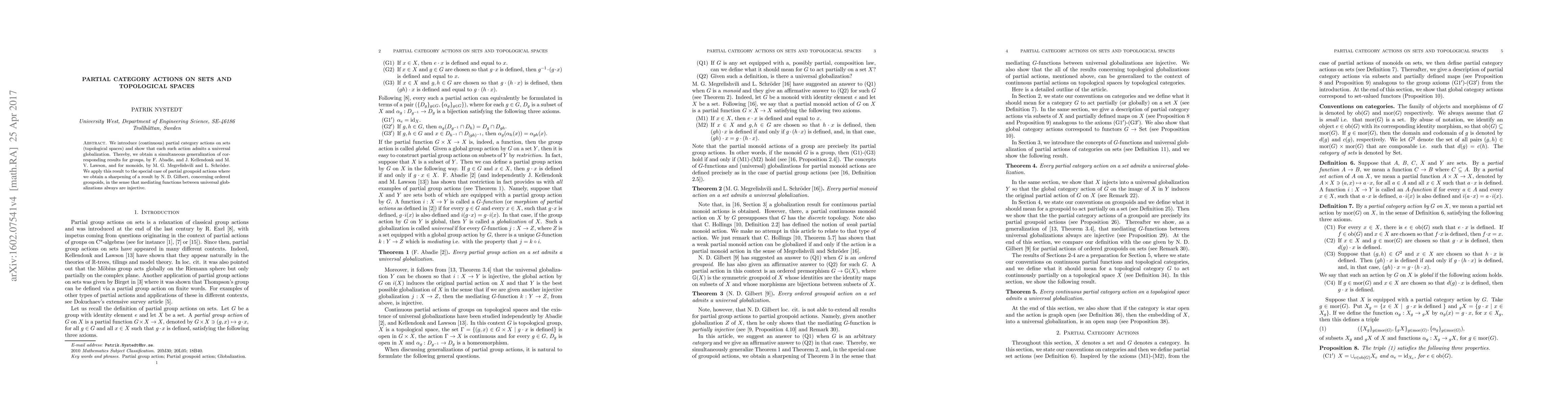 We introduce (continuous) partial category actions on sets (topological spaces) and show that each such action admits a universal globalization. Thereby, we obtain a simultaneous generalization of corresponding results for groups, by Kellendonk and Lawson, and for monoids, by Megrelishvili and Schroder. We apply this result to the special case of partial groupoid actions where we obtain a sharpening of a result by Gilbert, concerning ordered groupoids, in the sense that mediating functions between universal globalizations always are injective.
