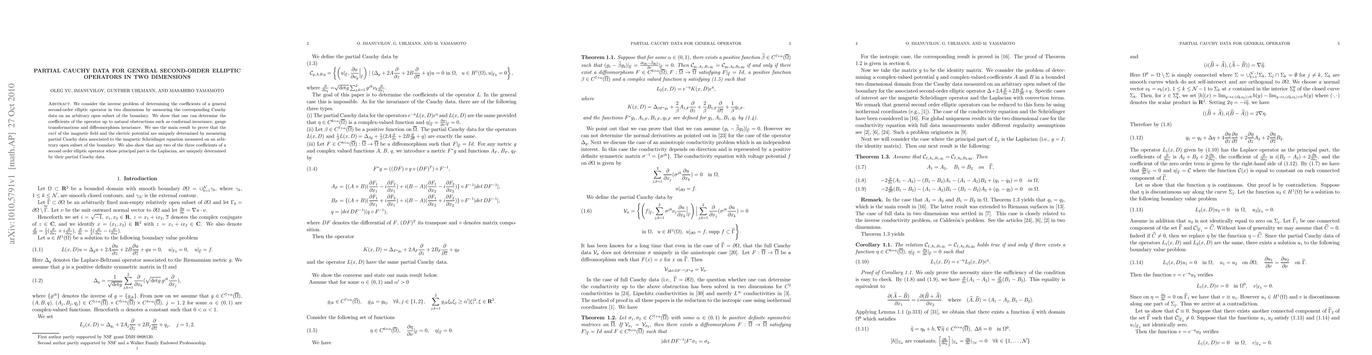 We consider the inverse problem of determining the coefficients of a general second-order elliptic operator in two dimensions by measuring the corresponding Cauchy data on an arbitrary open subset of the boundary. We show that one can determine the coefficients of the operator up to natural obstructions such as conformal invariance, gauge transformations and diffeomorphism invariance. We use the main result to prove that the curl of the magnetic field and the electric potential are uniquely determined by measuring partial Cauchy data associated to the magnetic Schroedinger equation measured on an arbitrary open subset of the boundary. We also show that any two of the three coefficients of a second order elliptic operator whose principal part is the Laplacian, are uniquely determined by their partial Cauchy data.