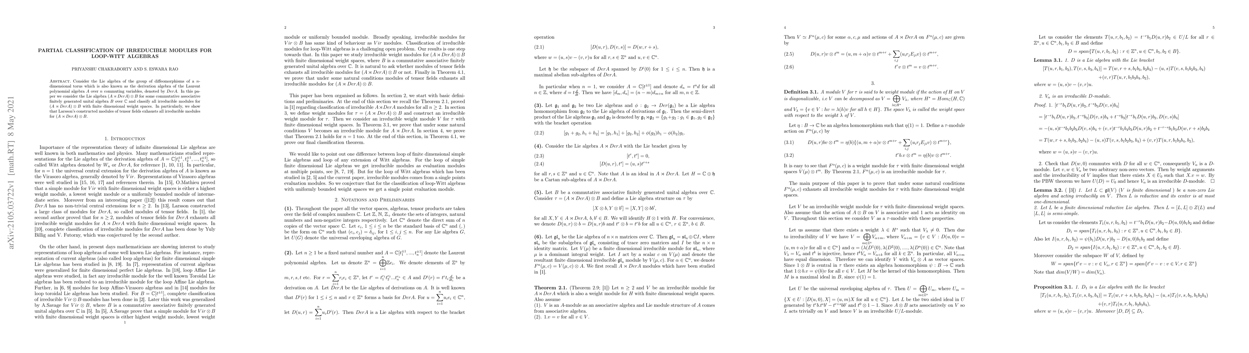 In this paper we study irreducible modules for loop of $A\rtimes DerA$ with finite dimensional weight spaces. In particular, we show that Larsson's constructed modules of tensor fields exhausted all irreducible modules.