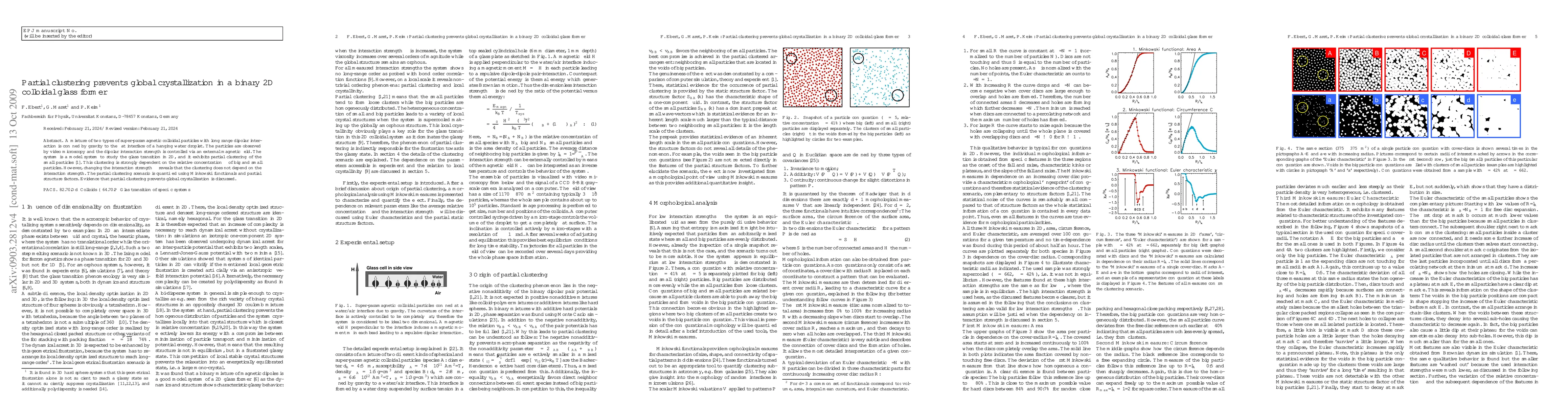 A mixture of two types of super-paramagnetic colloidal particles with long range dipolar interaction is confined by gravity to a flat interface of a hanging water droplet. The particles are observed by video microscopy and the dipolar interaction strength is controlled via an external magnetic field. The system is a model system to study the glass transition in 2D, and it exhibits partial clustering of the small particles. This clustering is strongly dependent on the relative concentration $\xi$ of big and small particles. However, changing the interaction strength $\Gamma$ reveals that the clustering does not depend on the interaction strength. The partial clustering scenario is quantified using Minkowski functionals and partial structure factors. Evidence that partial clustering prevents global crystallization is discussed.