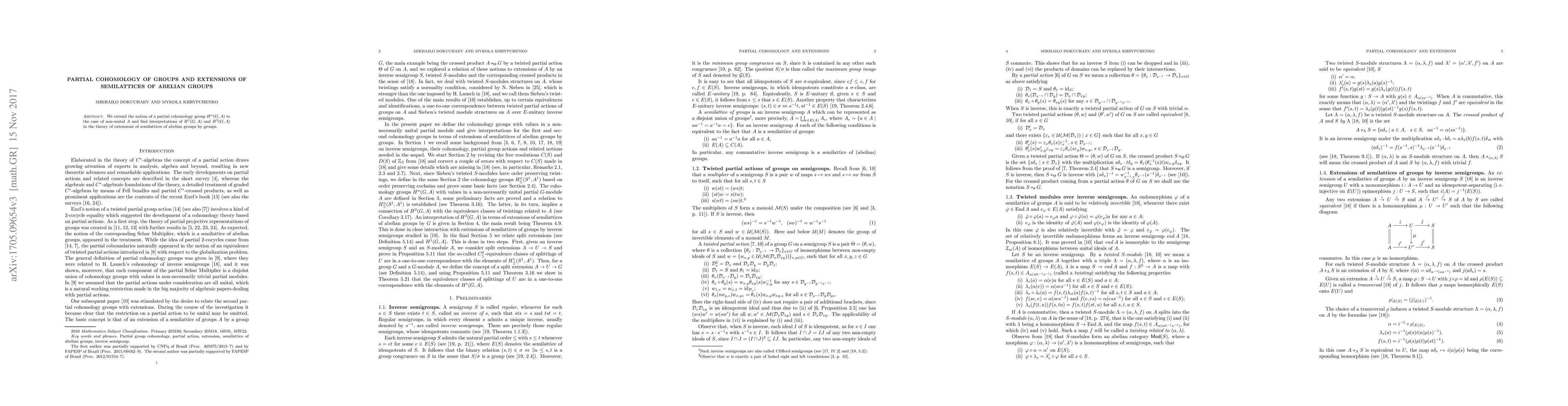 We extend the notion of a partial cohomology group $H^n(G,A)$ to the case of non-unital $A$ and find interpretations of $H^1(G,A)$ and $H^2(G,A)$ in the theory of extensions of semilattices of abelian groups by groups.