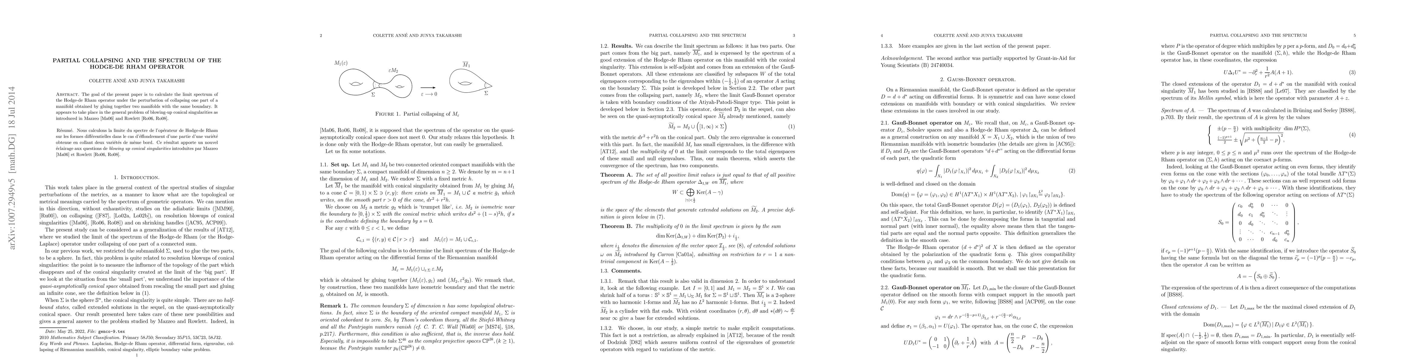 The goal of the present paper is to calculate the limit spectrum of the Hodge-de Rham operator under the perturbation of collapsing one part of a manifold obtained by gluing together two manifolds with the same boundary. It appears to take place in the general problem of blowing up conical singularities as introduced in \cite{Maz} and \cite{Row1,Row2}.