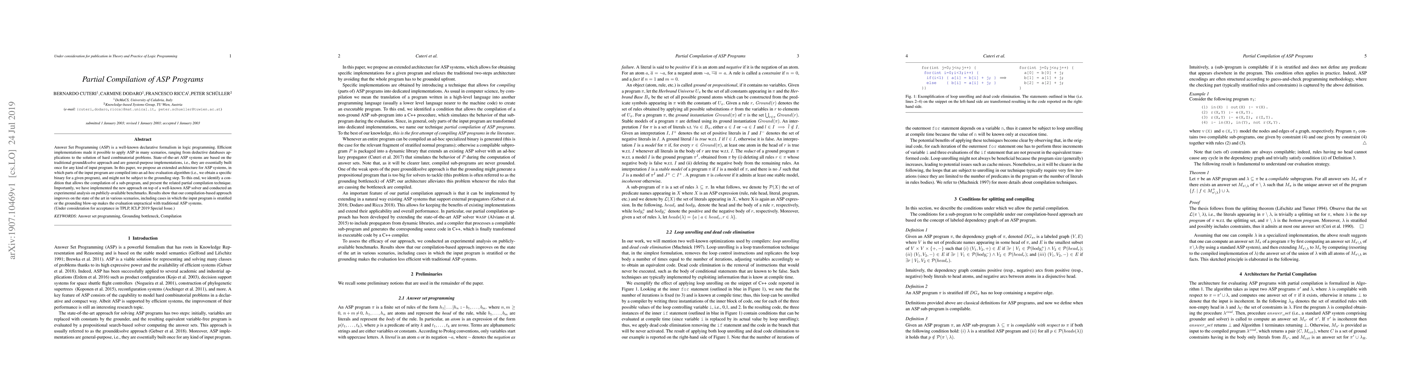 This paper proposes an extended architecture for Answer Set Programming (ASP) systems that compiles parts of the input program into specific evaluation algorithms, bypassing the traditional grounding step. The authors identify a condition for partial compilation and demonstrate improved performance over state-of-the-art general-purpose implementations on various benchmarks.