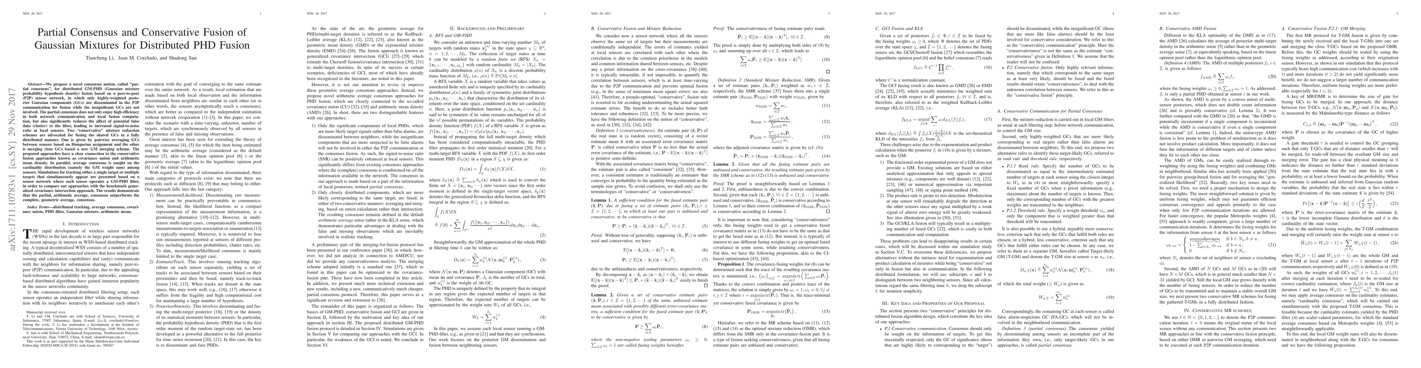 This paper introduces a "partial consensus" method for distributed Gaussian mixture probability hypothesis density (GM-PHD) fusion in sensor networks, where only significant Gaussian components are shared to enhance efficiency and reduce false data impact. It proposes two conservative fusion schemes for combining these components and demonstrates superior performance compared to generalized covariance intersection in simulations for single and multiple target tracking.