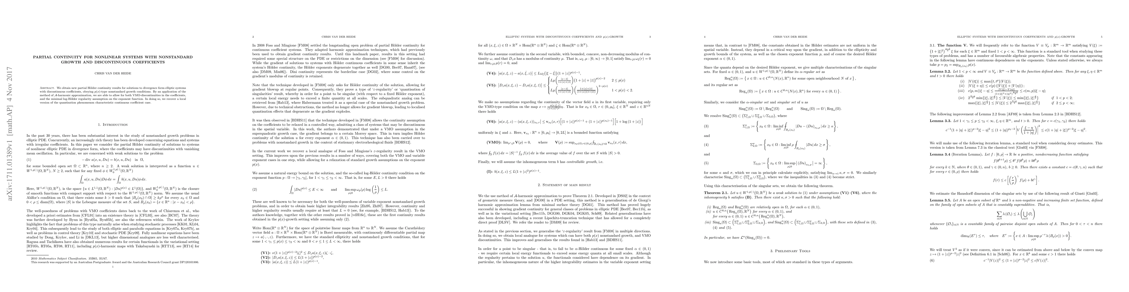 We obtain new partial H\"older continuity results for solutions to divergence form elliptic systems with discontinuous coefficients, obeying $p(x)$-type nonstandard growth conditions. By an application of the method of $\mathcal{A}$-harmonic approximation, we are able to allow for both VMO-discontinuities in the coefficients, and the minimal $\log$-H\"older regularity assumption on the exponent function. In doing so, we recover a local version of the quantisation phenomenon characteristic continuous coefficient case.