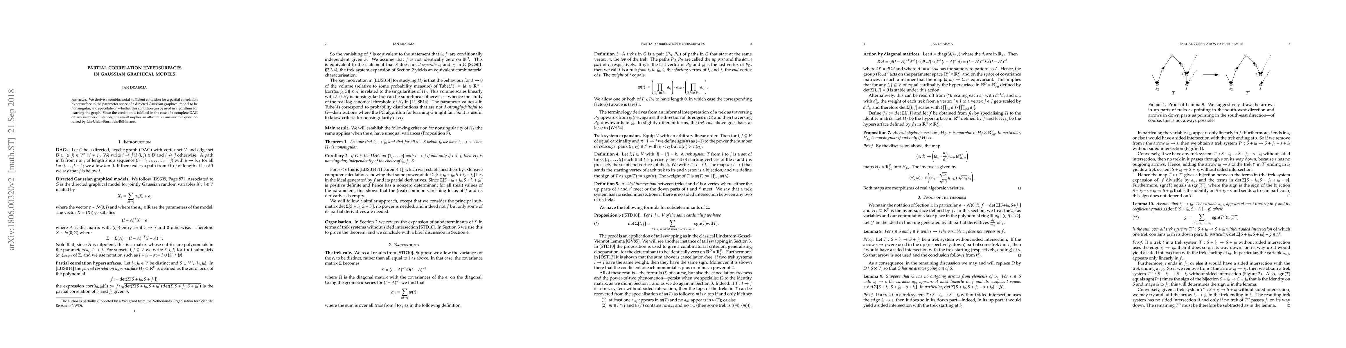 We derive a combinatorial sufficient condition for a partial correlation hypersurface in the parameter space of a directed Gaussian graphical model to be nonsingular, and speculate on whether this condition can be used in algorithms for learning the graph. Since the condition is fulfilled in the case of a complete DAG on any number of vertices, the result implies an affirmative answer to a question raised by Lin-Uhler-Sturmfels-B\"uhlmann.