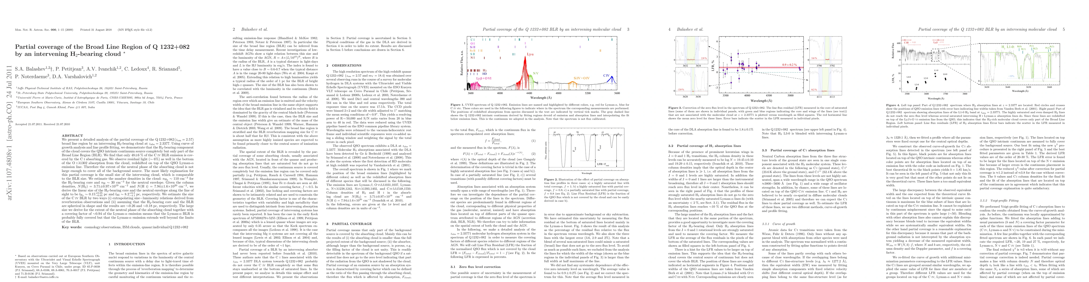 We present a detailed analysis of the partial coverage of the Q1232+082 (z_em =2.57) broad line region by an intervening H_2-bearing cloud at z_abs=2.3377. Using curve of growth analysis and line profile fitting, we demonstrate that the H_2-bearing component of the cloud covers the QSO intrinsic continuum source completely but only part of the Broad Line Region (BLR). We find that only 48\pm6 % of the C IV BLR emission is covered by the C I absorbing gas. We observe residual light (~6 %) as well in the bottom of the O I {\lambda}1302 absorption from the cloud, redshifted on top of the QSO Lyman-{\alpha} emission line. Therefore the extent of the neutral phase of the absorbing cloud is not large enough to cover all of the background source. The most likely explanation for this partial coverage is the small size of the intervening cloud, which is comparable to the BLR size. We estimate the number densities in the cloud: n_H2~110 cm^{-3} for the H_2-bearing core and n_H ~30 cm^{-3} for the neutral envelope. Given the column densities, N(H2)=(3.71\pm0.97)\times10^19 cm^{-2} and N(H I)=(7.94\pm1.6)\times10^20 cm^{-2}, we derive the linear size of the H_2-bearing core and the neutral envelope along the line of sight to be l_H2~0.15^{+0.05}_{-0.05} pc and l_HI~8.2^{+6.5}_{-4.1} pc, respectively. We estimate the size of the C IV BLR by two ways (i) extrapolating size-luminosity relations derived from reverberation observations and (ii) assuming that the H_2-bearing core and the BLR are spherical in shape and the results are ~0.26 and ~0.18 pc, respectively. The large size we derive for the extent of the neutral phase of the absorbing cloud together with a covering factor of ~0.94 of the Lyman-{\alpha} emission means that the Lyman-{\alpha} BLR is probably fully covered but that the Lyman-{\alpha} emission extends well beyond the limits of the BLR.