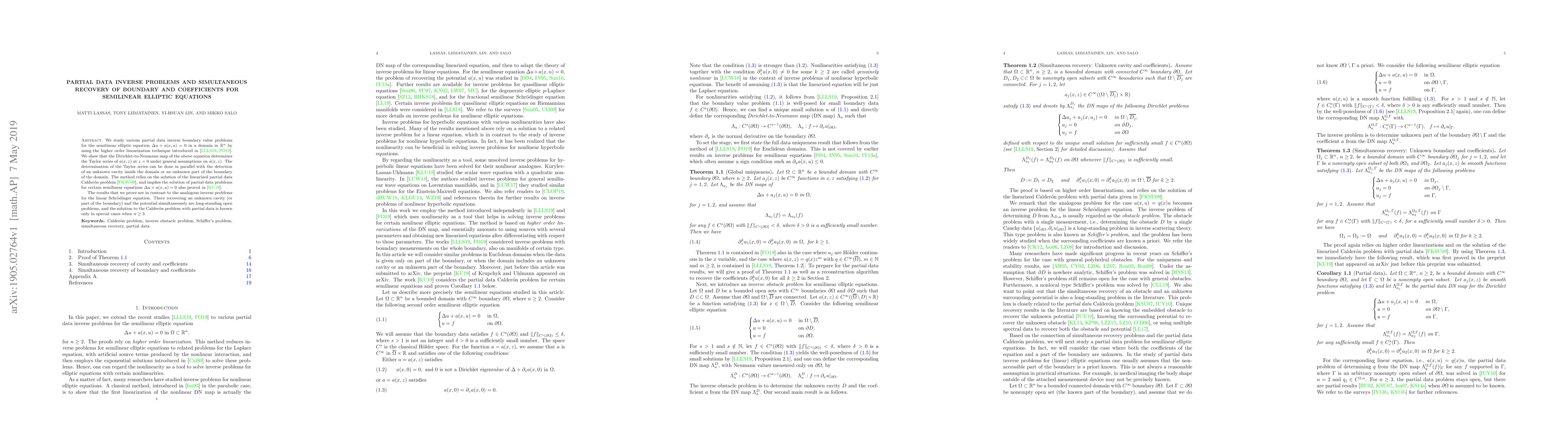 We study various partial data inverse boundary value problems for the semilinear elliptic equation $\Delta u+ a(x,u)=0$ in a domain in $\mathbb R^n$ by using the higher order linearization technique introduced in [LLS 19, FO19]. We show that the Dirichlet-to-Neumann map of the above equation determines the Taylor series of $a(x,z)$ at $z=0$ under general assumptions on $a(x,z)$. The determination of the Taylor series can be done in parallel with the detection of an unknown cavity inside the domain or an unknown part of the boundary of the domain. The method relies on the solution of the linearized partial data Calder\'on problem [FKSU09], and implies the solution of partial data problems for certain semilinear equations $\Delta u+ a(x,u) = 0$ also proved in [KU19]. The results that we prove are in contrast to the analogous inverse problems for the linear Schr\"odinger equation. There recovering an unknown cavity (or part of the boundary) and the potential simultaneously are long-standing open problems, and the solution to the Calder\'on problem with partial data is known only in special cases when $n \geq 3$.