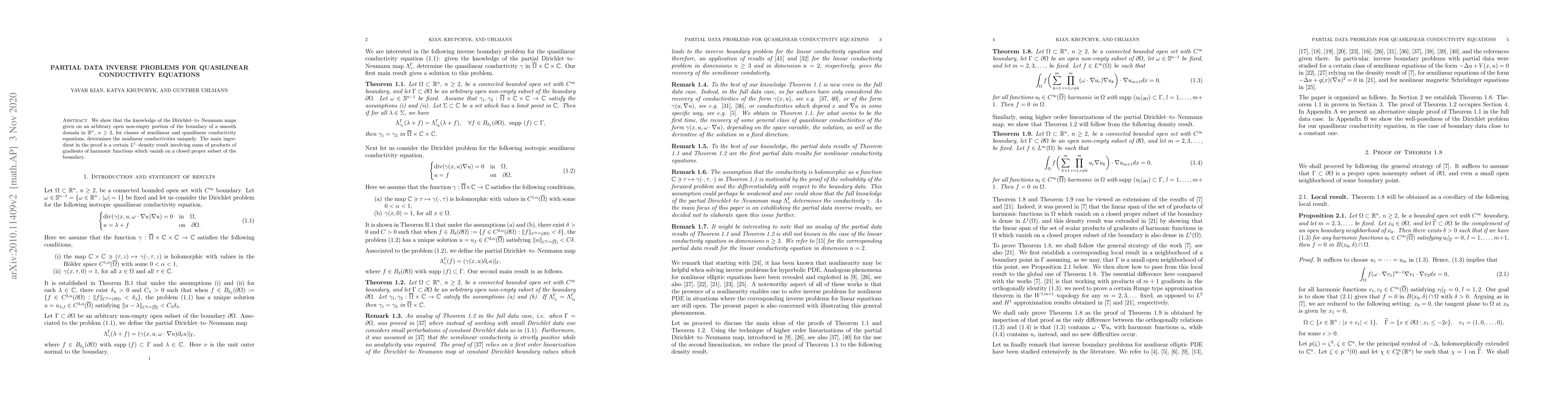 Researchers show that knowing the conductivity on a portion of a domain's boundary uniquely determines its nonlinear conductivities for certain types of quasilinear equations.