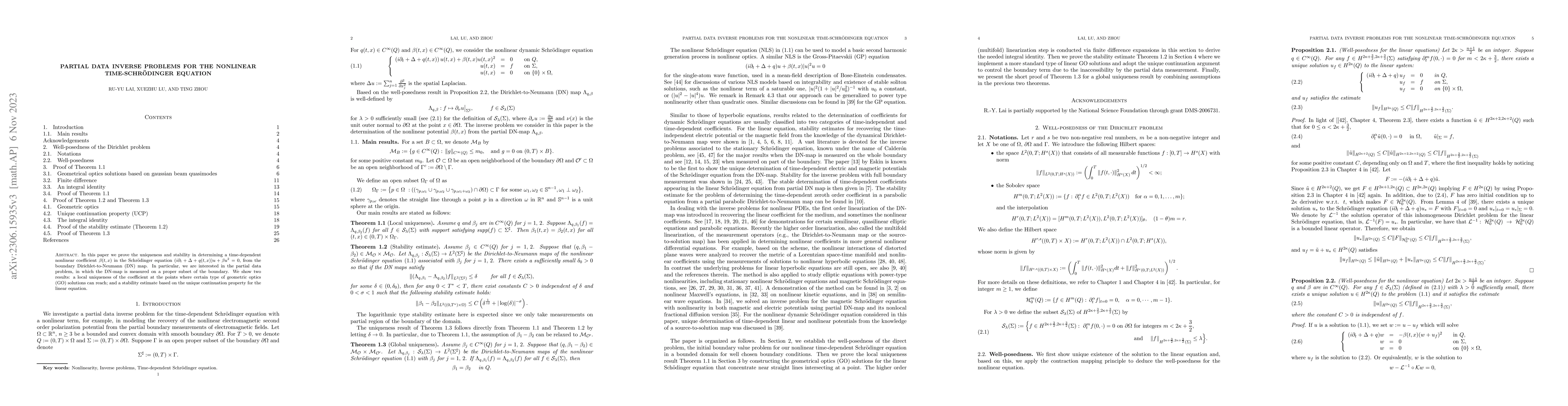 This paper proves uniqueness and stability for determining a time-dependent nonlinear coefficient in the Schrödinger equation from partial boundary data, specifically the Dirichlet-to-Neumann map on a subset of the boundary. It establishes local uniqueness where geometric optics solutions can reach and provides a stability estimate based on unique continuation properties.